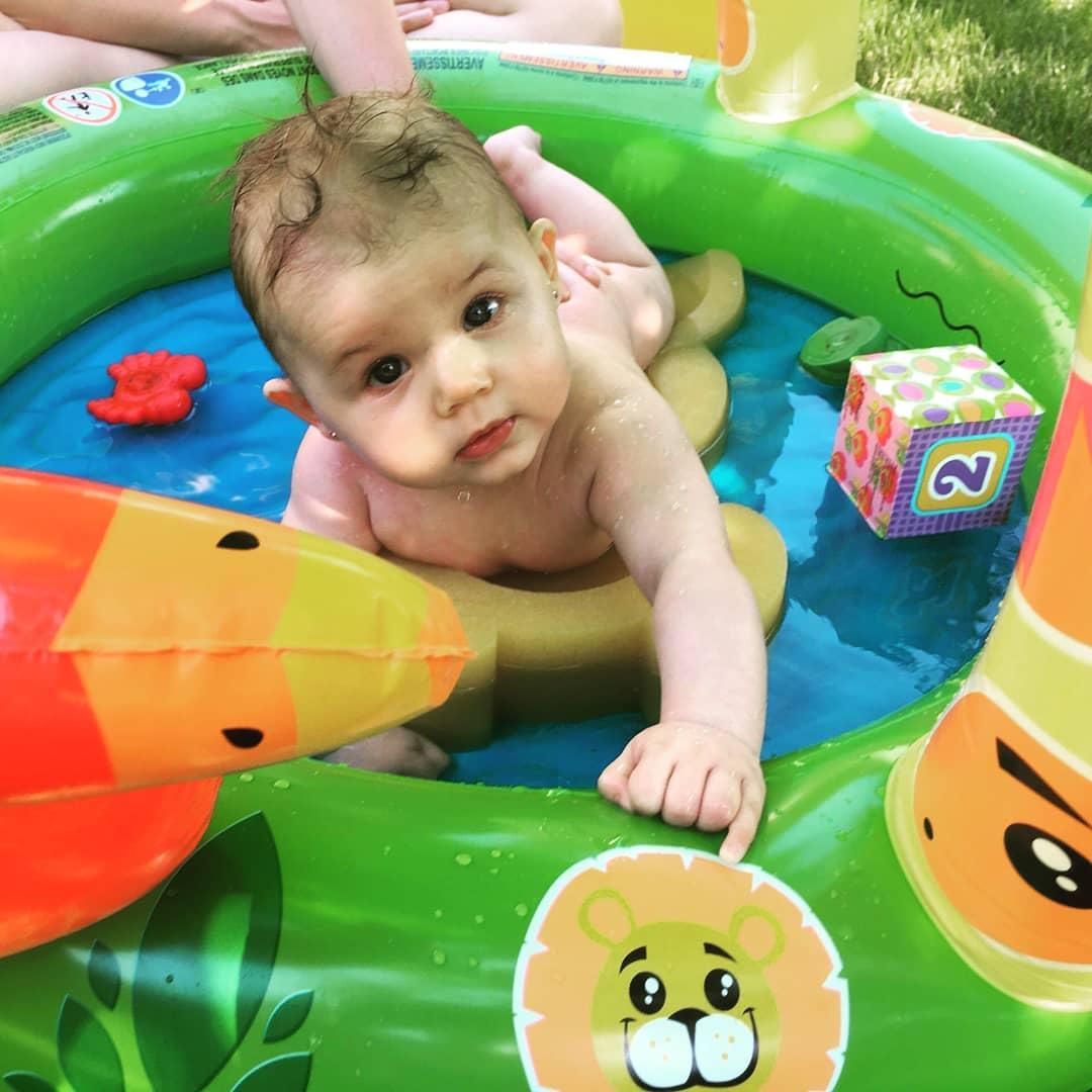 Dcera má 10 měsíců a stejně jako starší syn vodu miluje. Koupe se moc ráda ve vaně, ale i v dětském nebo normálním bazénku, v tomto počasí se stejně nedá dělat nic jiného 🙂
