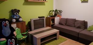 Přikládám foto obývacího pokoje, kde trávíme většinu času. TV máme pověšenou na multifunkčním držáku na stěně.