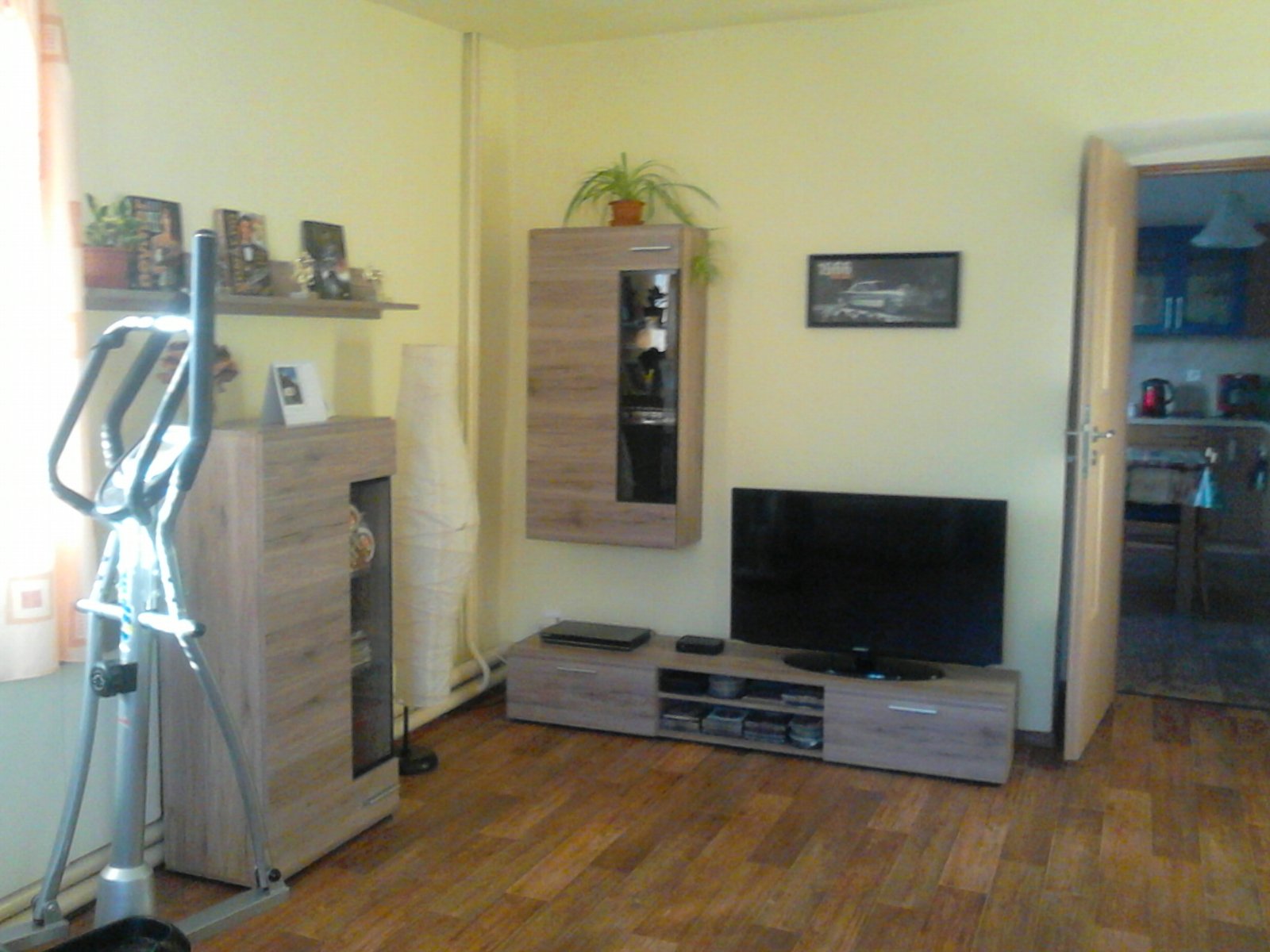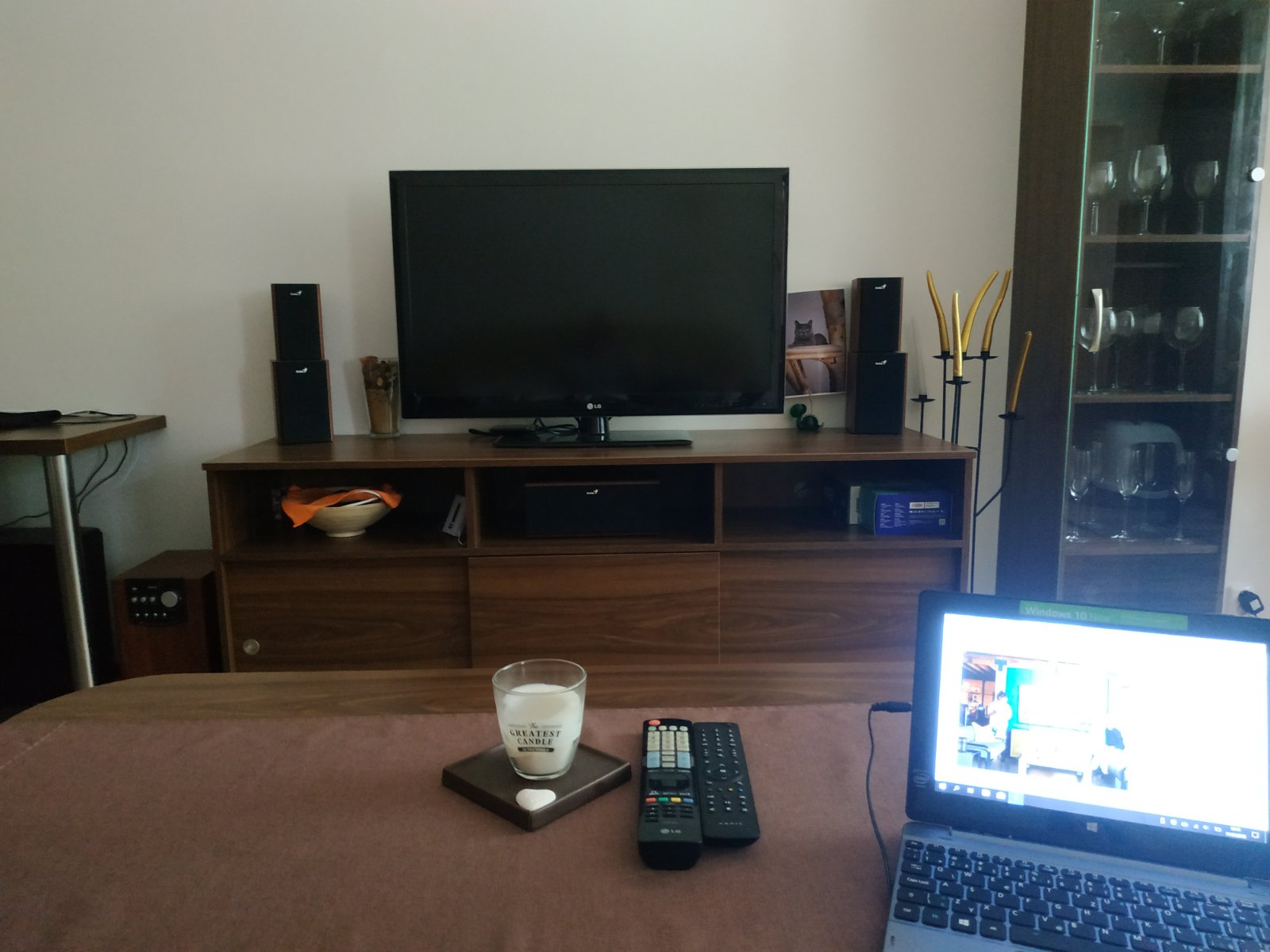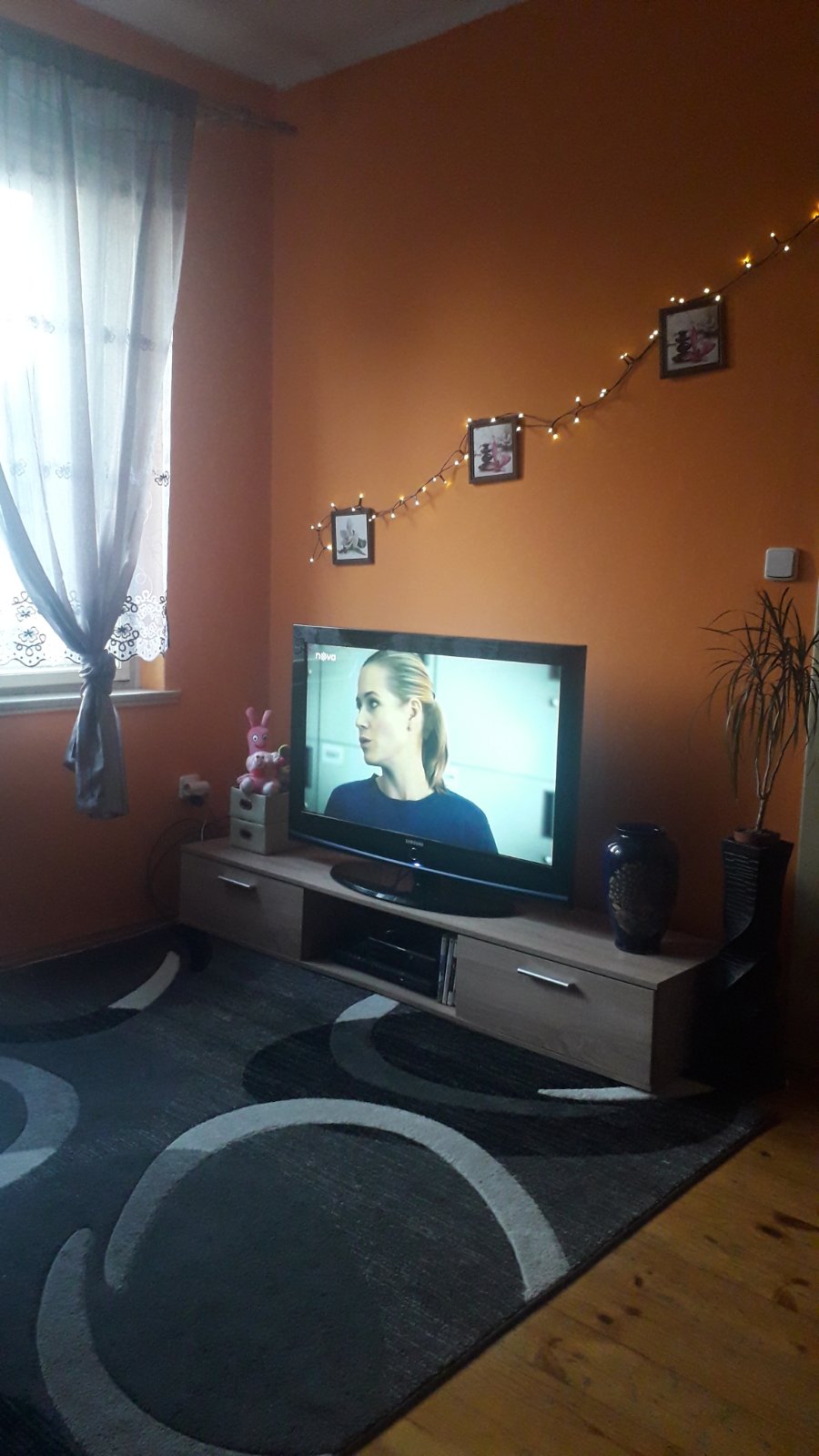 Jsme z Tábora. Televize u nás běží především během nemoci, kdy koukáme na oblíbené pohádky a večer, když je nezbytné zlo jménem žehlení. Televizi máme nyní zavěšenou na zdi, taktéž Samsung. Novou televizi budu muset pořídit, protože si s dceruškou rekonstruji nové bydlení v paneláku. Od TV očekávám aby měla nízkou spotřebu, byla kompatibilní se současnými přístroji (minivěž Samsung, telefon), aby měla již připojení na wifi a především, aby byla co nejšetrnější k očím. Foto obýváku mohu připojit pouze toto, to se však během následujících dvou týdnů změní.