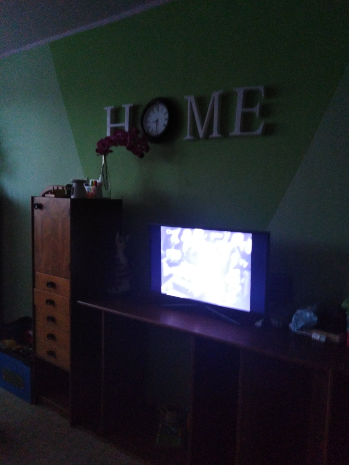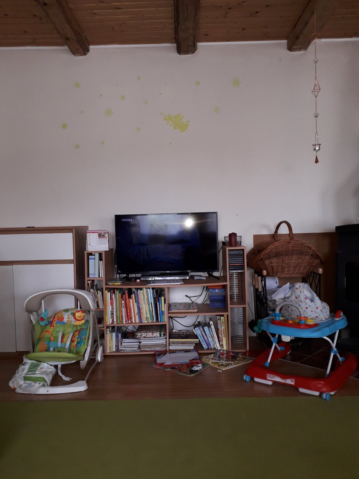 Jsme teď čerstvě přestěhování z Brna do Třebíče. V domku zatím máme původní tv z bytu, ale rozhodně to chce větší... A rozhodně na stěnu, udělali jsme i tunel ve zdi, aby nebyly vidět dráty.