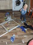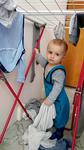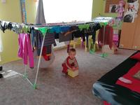 Sušáky na prádlo máme doma dva, nikdy nepoužívám jen jeden, protože máme pořád co sušit. Kolikrát mi ani ty dva nestačí a tak mám ještě všude možně po domě na radiátorech rozvěšené ručníky, ponožky a další prádlo, momentálně i na krbové zábraně, tam to pěkně schne 😀 Kluci jsou moji pomocníčci, dávají špinavé prádlo do pračky, vytahují vyprané do prádelního koše, podávají mi kolíčky, ale taky čerstvě pověšené, ještě mokré stahují na podlahu (viz foto, foceno v létě, 5 minut po tom, co jsem dověšela). Ne jednou na sebe převrhli celý sušák i s prádlem, takže když věším prádlo večer, dám si ho do obyváku, protože tu je největší teplo, ale hned ráno sušáky musím stěhovat do jiné místnosti, protože mi to hlavně ten mladší hned vše posundává.