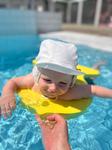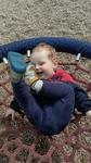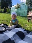 Leze, stojí bez opory takže už chybí jen ten krůček k chození 😍 plínky jsou i super jako pokrývka hlavy, když mamka zapomene čepici proti sluníčku 💪😅