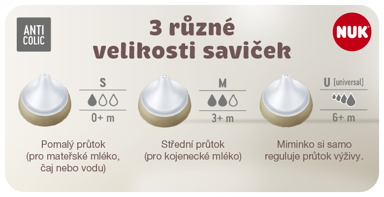 Jednoznačně preferujeme antikolikovy ventil, který udržuje vzduch mimo bříško a pomáhá ke snížení rizika koliky, nadýmání a refluxu. Anatomicky tvarovaná savička, která podporuje správný vývoj zoubků i patra. Po otočení plné láhvičky, dnem vzhůru, by měla kapat 2-3 kapky za minutu.