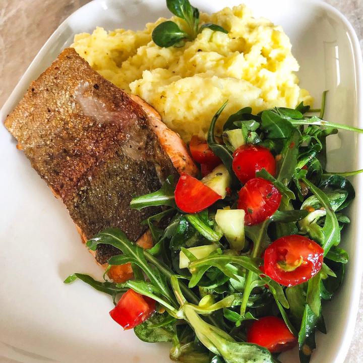 Jako oblohu jsem zvolila kaši, protože ta u nás dlouho nebyla a k tomu Rukolovo-polníčkový salát se zeleninou a špetkou sweet-chilly omáčky s ananasem 🤩
