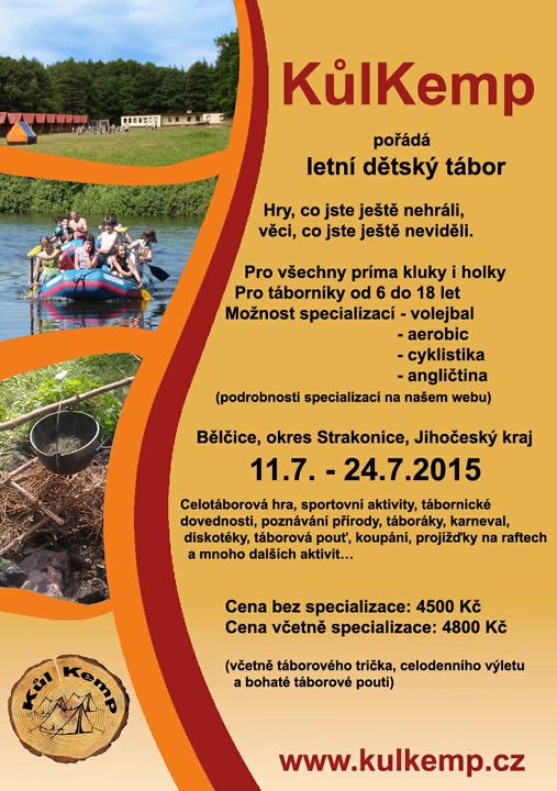 Letní dětský tábor pro děti od 6 let s možnosti výběru specializace aerobic, angličtina, cyklistika a nebo volejbal (možnost i bez specializace)...Termín od 11. do 24.7.2015 v Belcicich (okres Strakonice), odjezd z Prahy autobusem nebo možné přivézt děti primo na tábor.