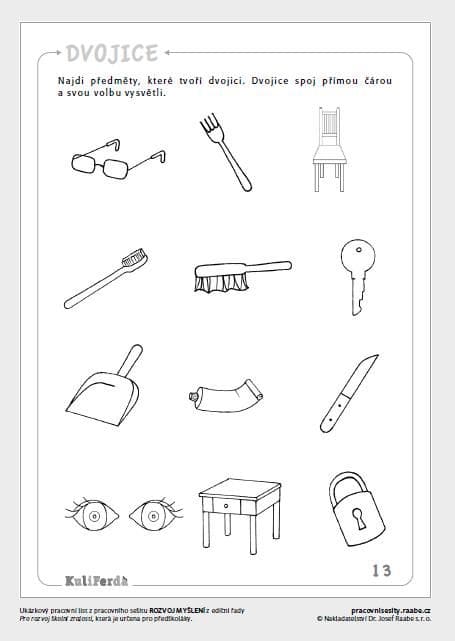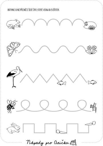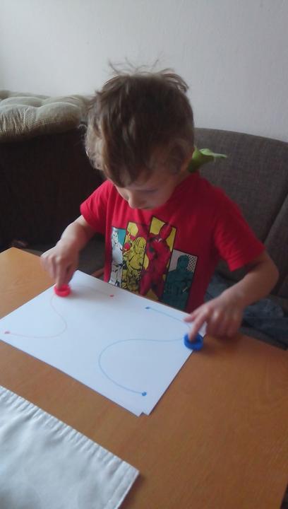 Nakreslené čáry, kroužky... Od bodu k bodu zrcadlově a prsty musí s víčkem jet po nich.