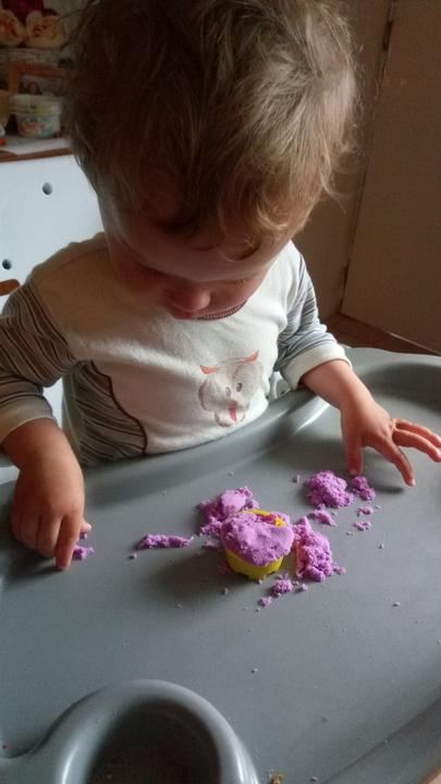 Takže baví ho to, venku prší, in si hraje skoro hodinu ani nechtěl snídat.