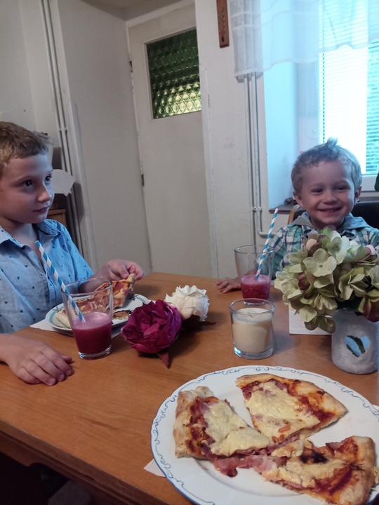 Domácí práce a pochůzky a pak hry, logopegii, opalovačka, bazén, domácí jogurt, domácí ledová tříšť, domácí pizza.