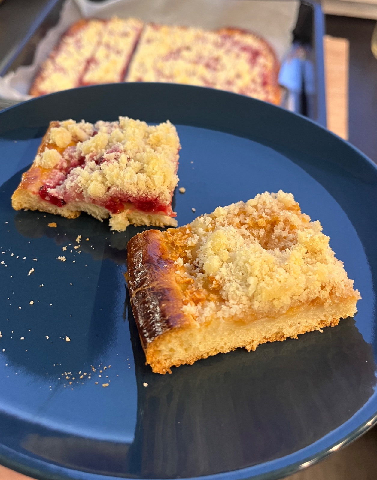 Prošívanou buchtu, jogurtový koláč s ovocem a drobenkou, u nás jede čokoládový koláč z podmáslí.