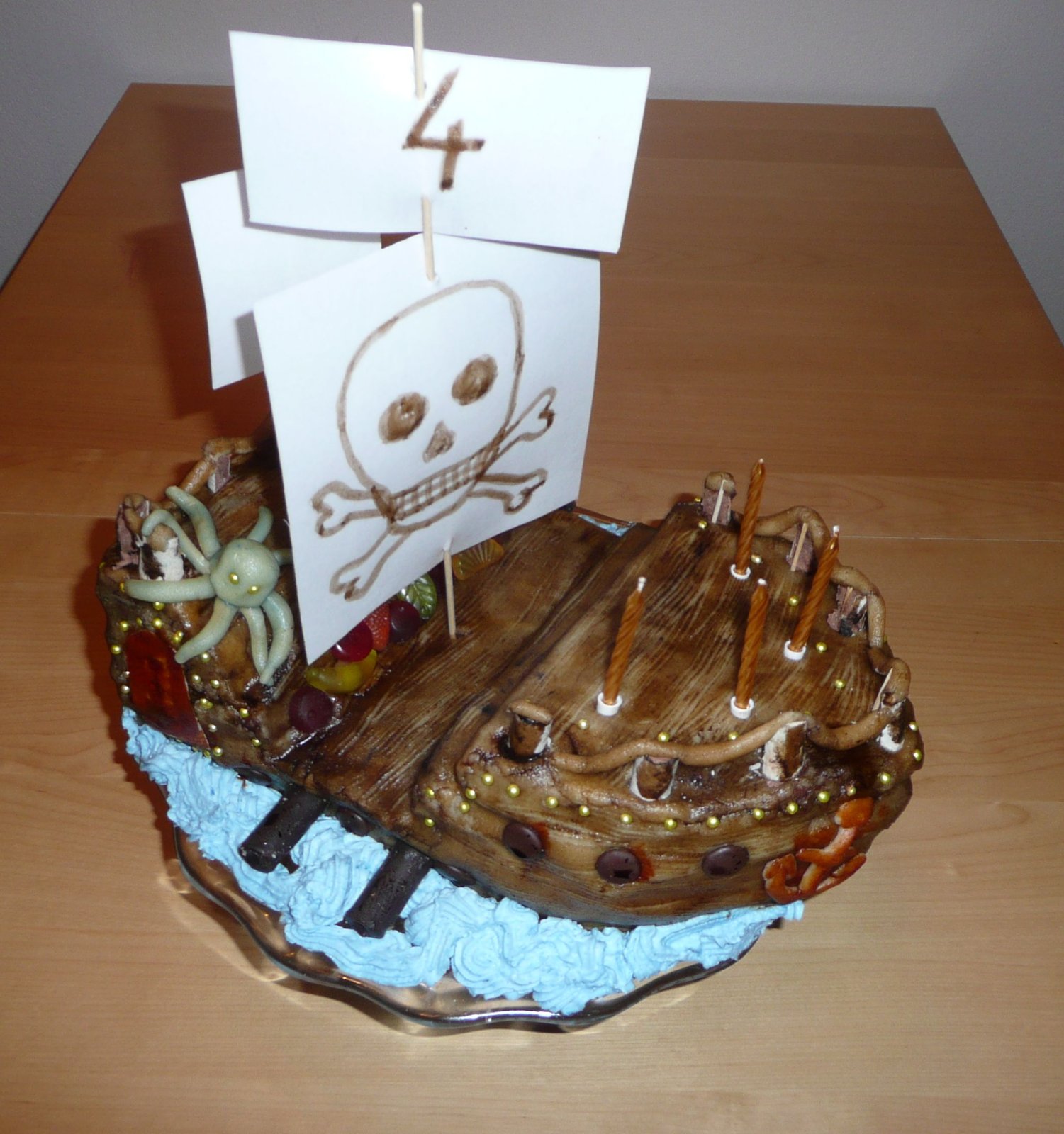 Dělala jsem před 6 lety, byl to jeden z mých prvních dortů pro děti, ale třeba jako inspirace pomůže. Děla jsou z hořických trubiček, sloupky zábradlí taky, vršek zábradlí z marcipánu, ale teplem doma se pak začalo prověšovat.... poklad na palubě jsou gumídci a plachty jsou z jedlého papíru (nešel moc prohnout a jíst to nikdo nechtěl, takže zbytečná investice, udělala bych ho z pergamenu - peč.papíru...). Tak hodně štěstí a nervů, u nás už kluci odrostli pirátům, takže dělám lego dorty, případně dort s planetami, což je taky lahůdka...😉