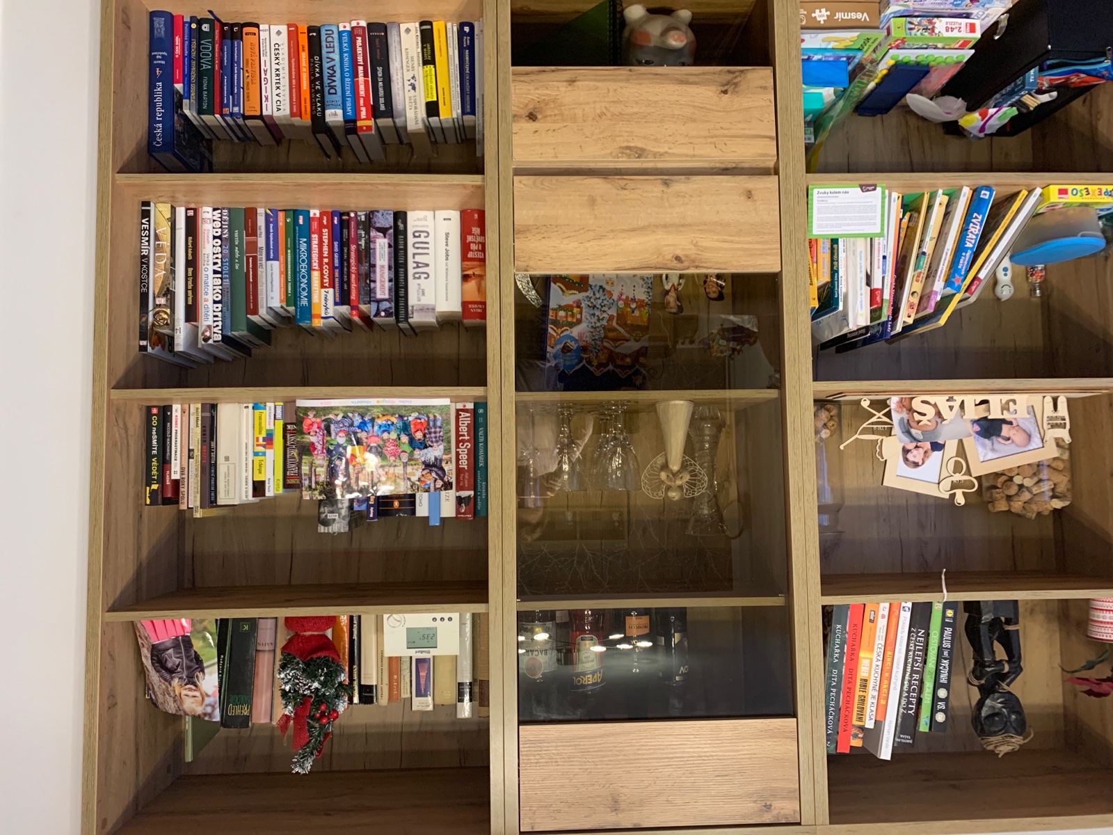 uprostřed knihovny máme jedny dvířka s poličkou, kde jsou lahve s alkoholem..., moc tedy nepijeme, a přímo bar jsme chvilku zvažovali, ale zamítli, z tohoto jde udělat kdykoliv cokoliv jiného..., všude kolem jsou knihy 🙂)