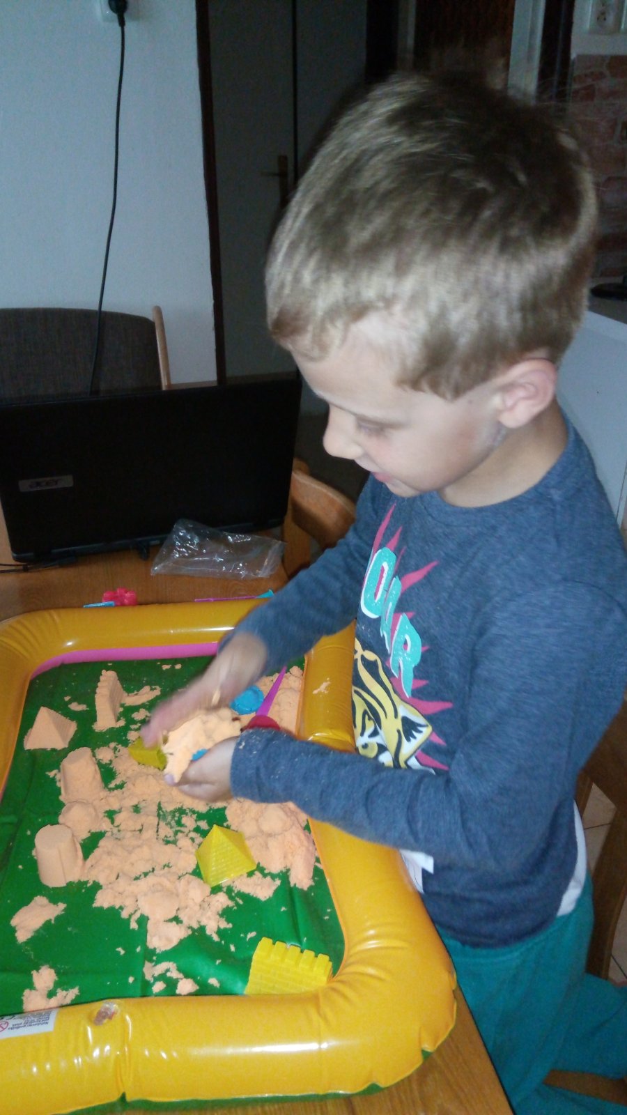Takže baví ho to, venku prší, in si hraje skoro hodinu ani nechtěl snídat.