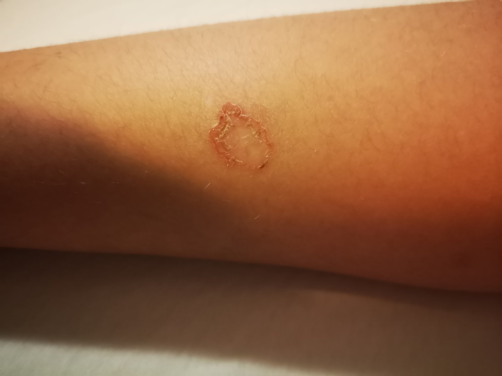 Dcera ma uz delsi dobu tenhle flek. Uvnitr normalni ruzova kuze a okolo na pohmat suche stroupky. Predtim to pry mela uprostred cervene a celkove to pry bylo trochu vetsi. Trochu ji to obcas svedi. Nevite co by to mohlo byt? Nebo cim mazat? Dekuji