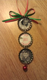 ozdoba na stromček z fotiek a vrchnákov z flaše od piva :-)