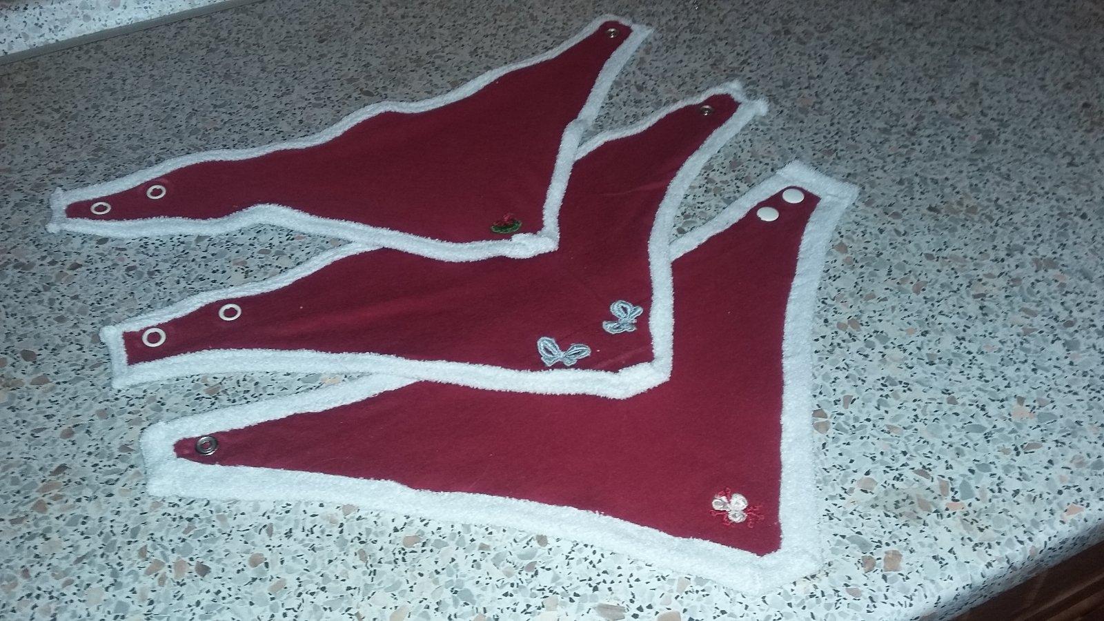Tohle je háčkovaná patchwork deka na hraní přední a zadní strana z fleecu, a tři červenobílé bryndáčky.