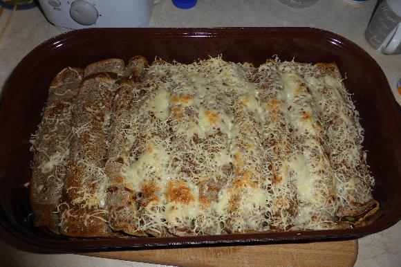 Zapečené pohankové palačinky se špenátem a krůtím masem.