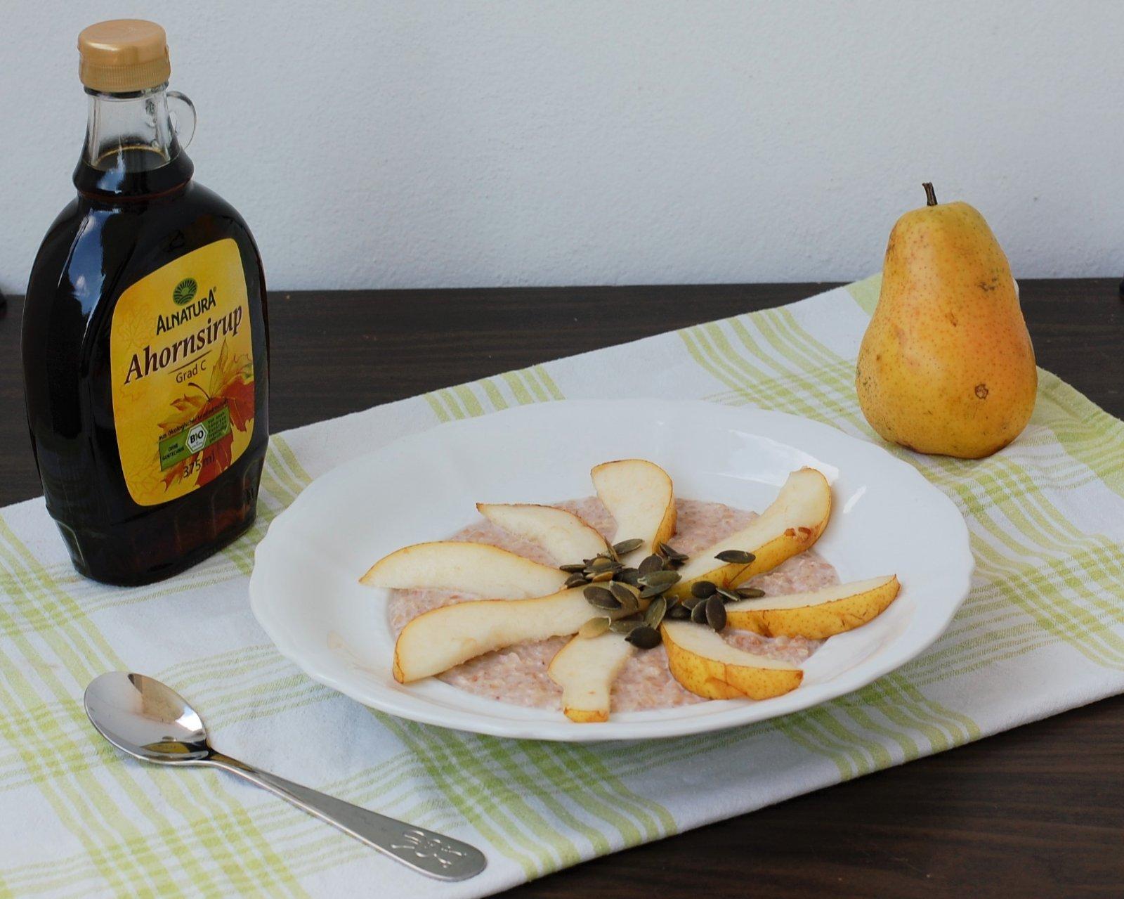 Pohanková kaše s hruškou, javorovým sirupem a dýňovými semínky