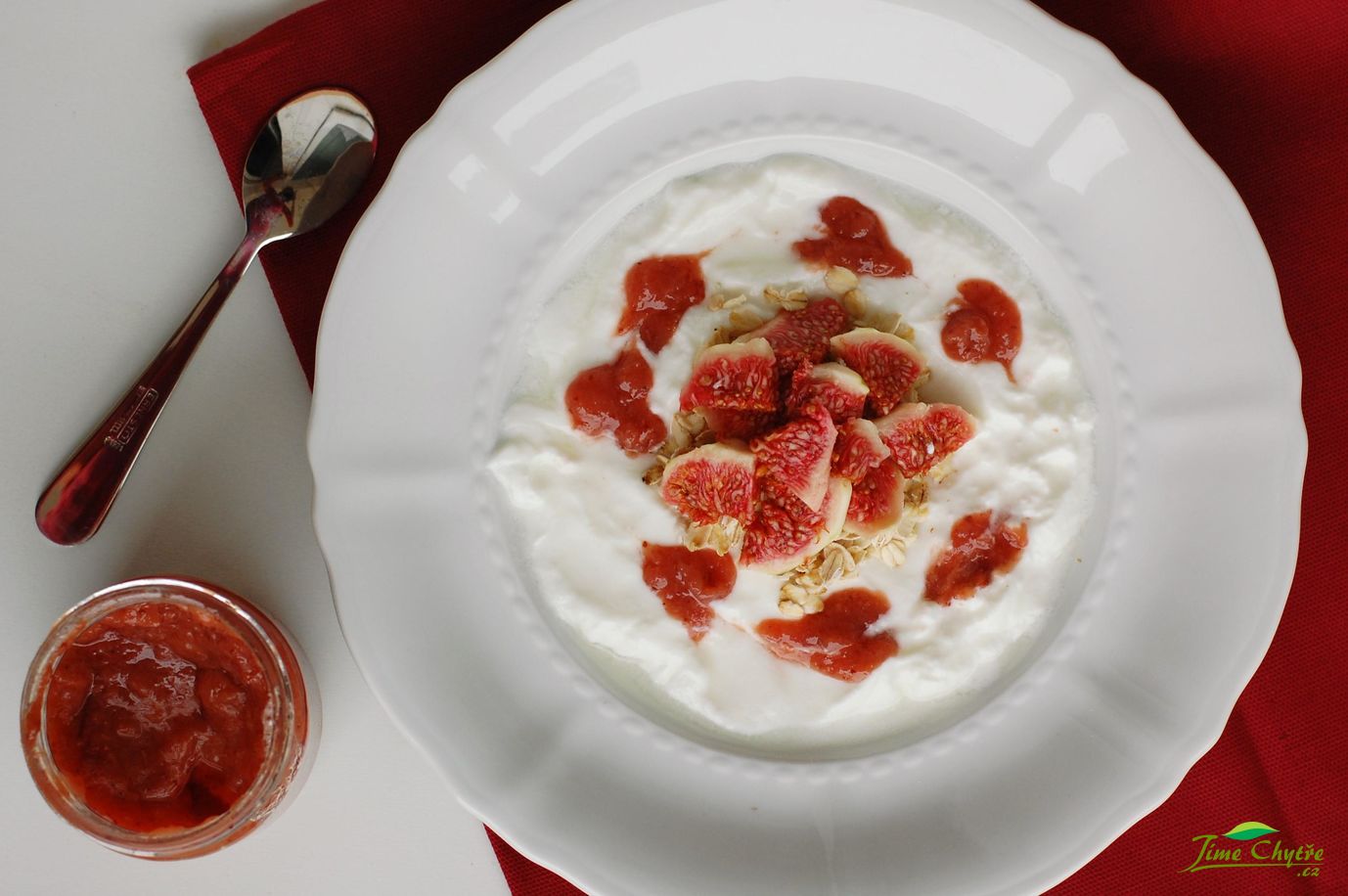 Snídaně - jogurt slazený marmeládou, s ječnými vločkami a ovocem