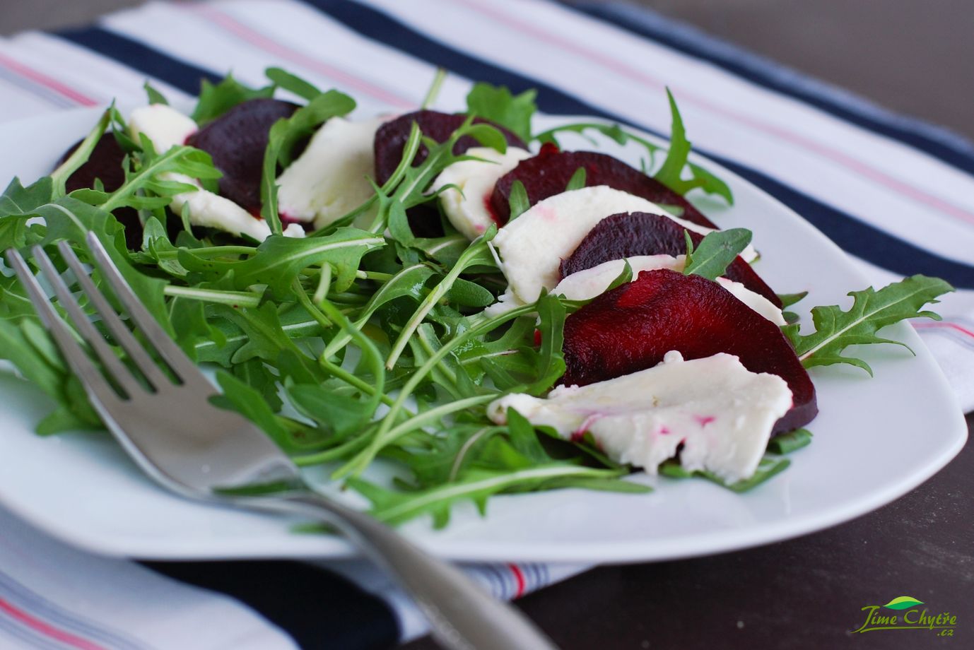 Ten salát vypadá krásně. 🙂 Jen se mi jeho pruhovaná struktura tluče s pruhovanou strukturou ubrusu. Myslím, že na jednobarevném by lépe vynikl. 🙂