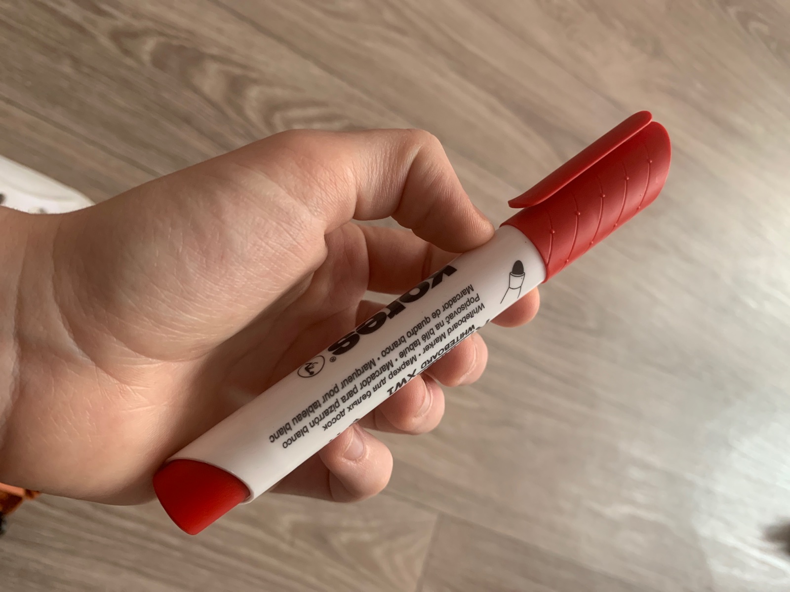Fixu na bílou tabuli jsem z oblečení nedostala, ale naštěstí to je jen domácí oblečení, tak jsem to urputně dolu teda nedávala...