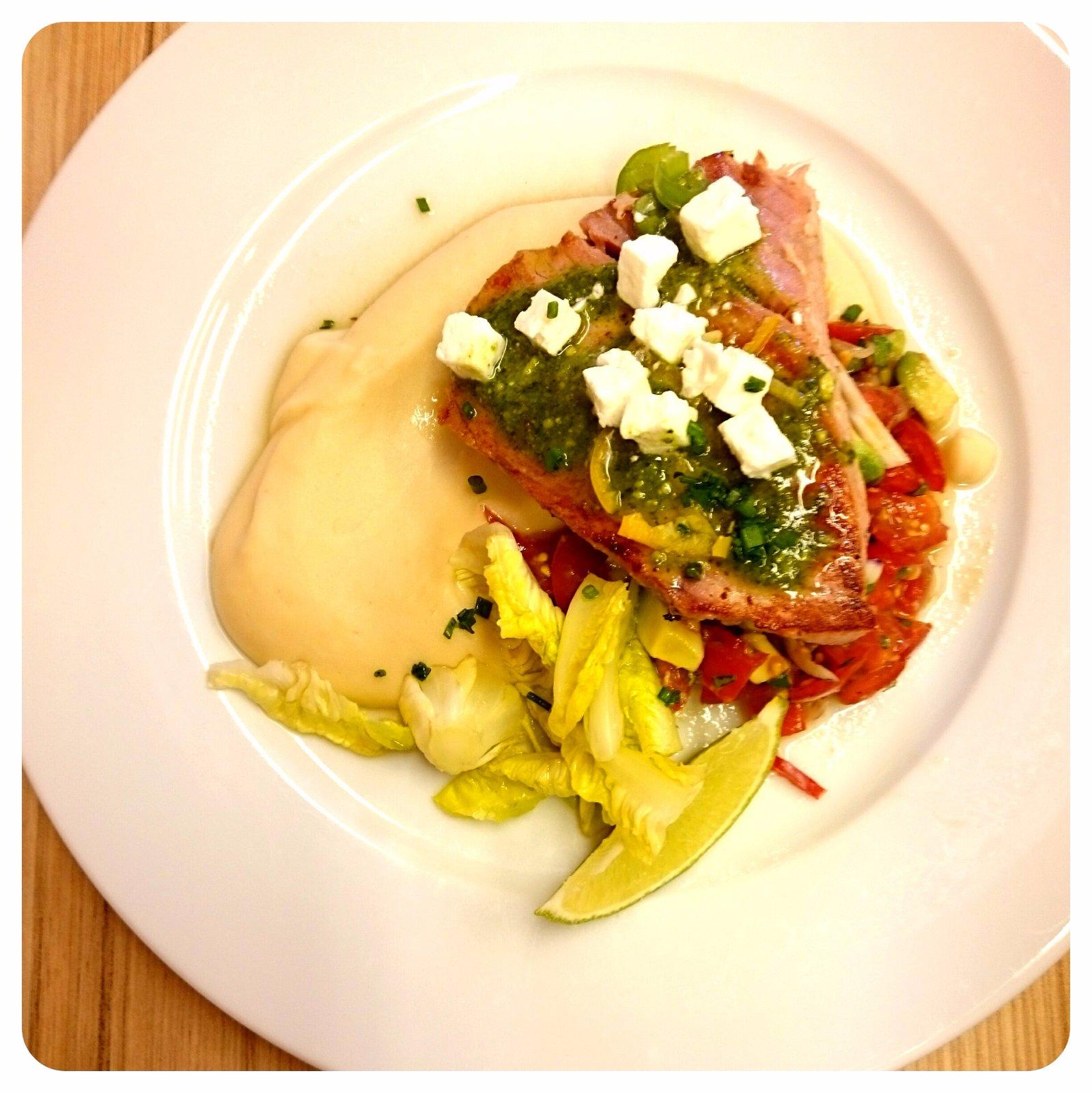 Opečený tuniak, pyré z bielej fazule, avokádovo - paradajkový šalát, pesto z bazalky a kešu orechov, feta syr.