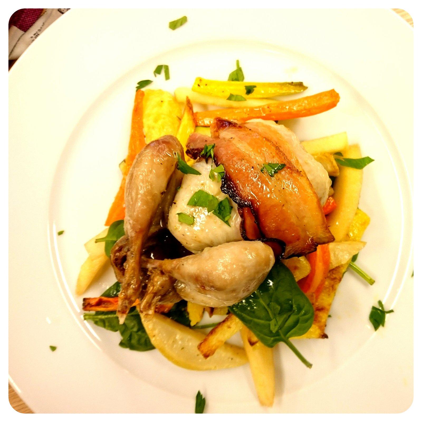 Pečená prepelica so zeleninovými hranolkami: zeler, mrkva, zemiak, cukina, kaleráb.