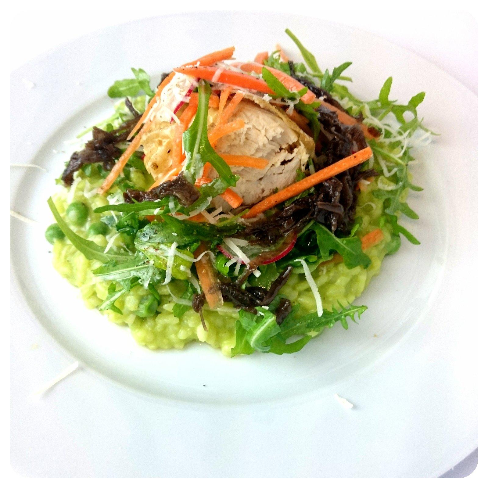 Hráškové rizoto s kuriatkom, confit (v tuku pomaly a dlho varená) z červenej cibule.