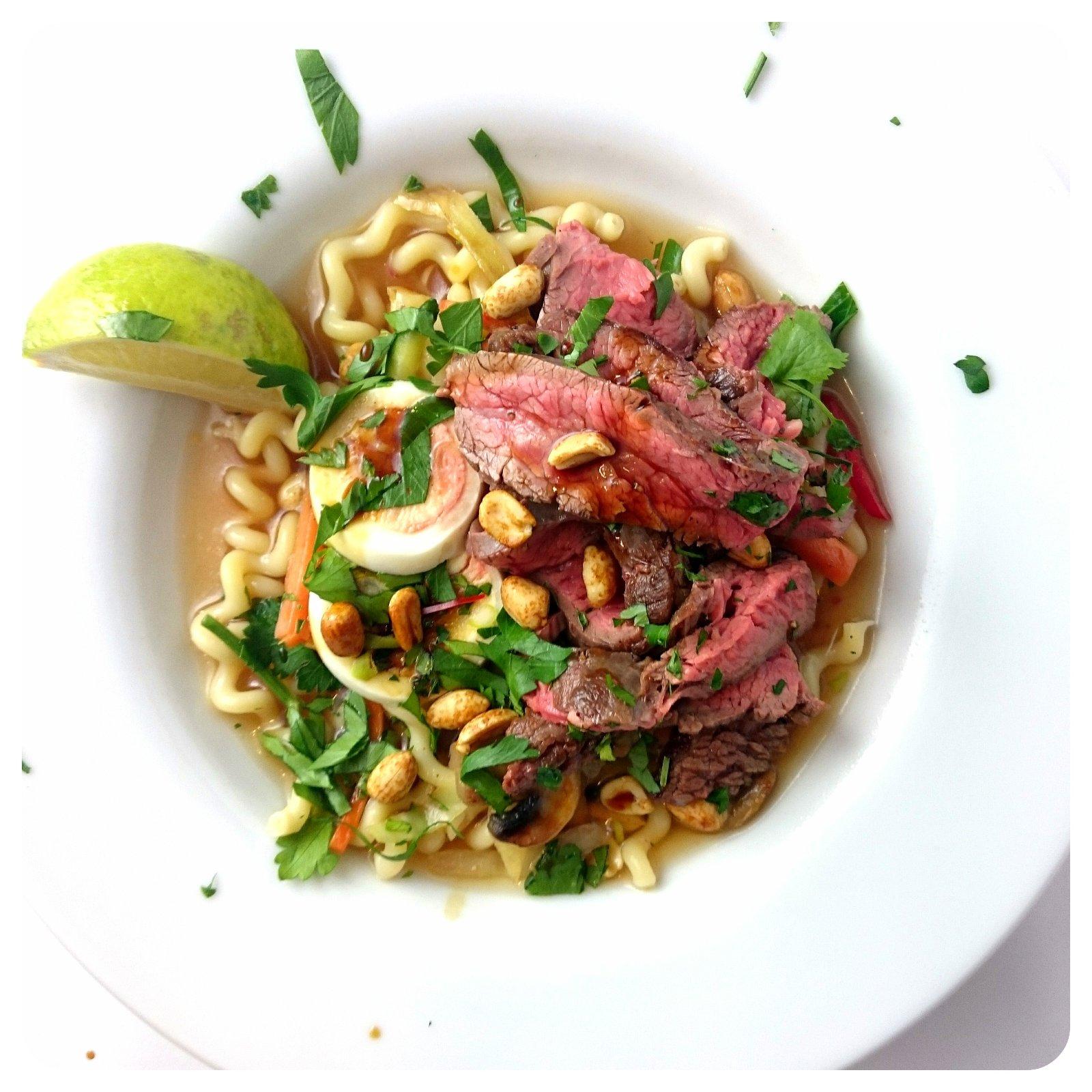 Hovädzí ramen s talianskymi cestovinami a vajíčkom.