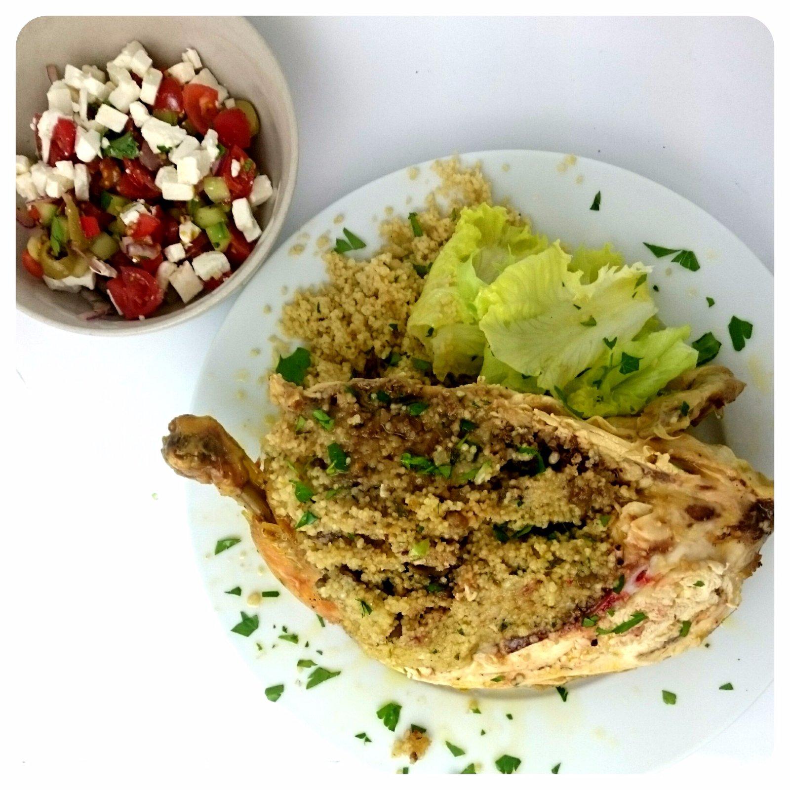 Opražíme cibuľku, gaštany a cesnak na masle, pridáme vývar (1,5 násobok množstva kuskusu), privedieme k varu. Vsypeme kuskus, odstavíme a necháme kuskus napučať. Nastrúhame doň pomarančovú kôru a vlejeme šťavu z pomaranča. Naplníme kuriatko, nohy zviažeme a pečieme.