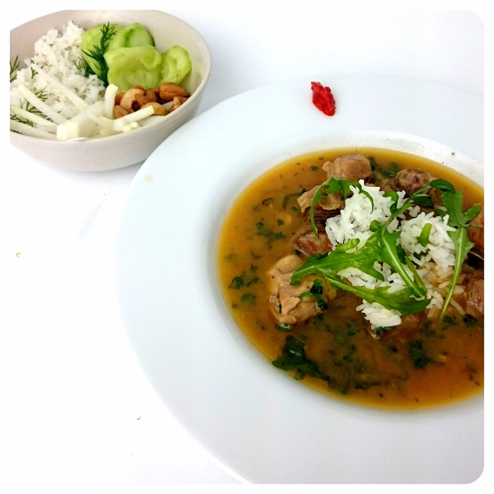 Garam masala morčacie curry s basmati ryžou, uhorkovým šalátom, pečenými orechami kešu a kalerábom
