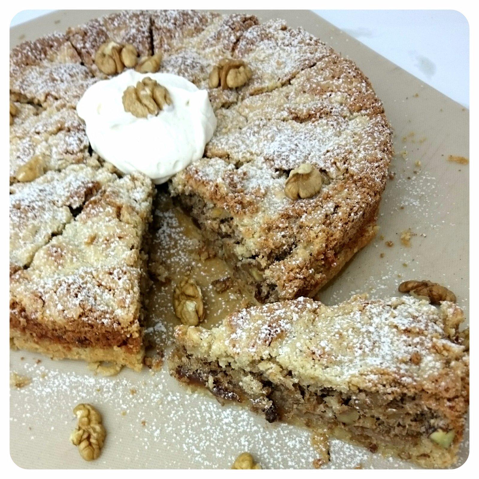aj tu ide o upravený recept z knihy Apetít "Koláče". My sme časť múky z cesta nahradili mletými mandľami (alebo ďalšiu časť pohánkovou múkou). Plnku sme poskladali z pekánových a vlašských orechov, znížili množstvo cukru a pridali hrozienka namočené v mandľovom likéri.