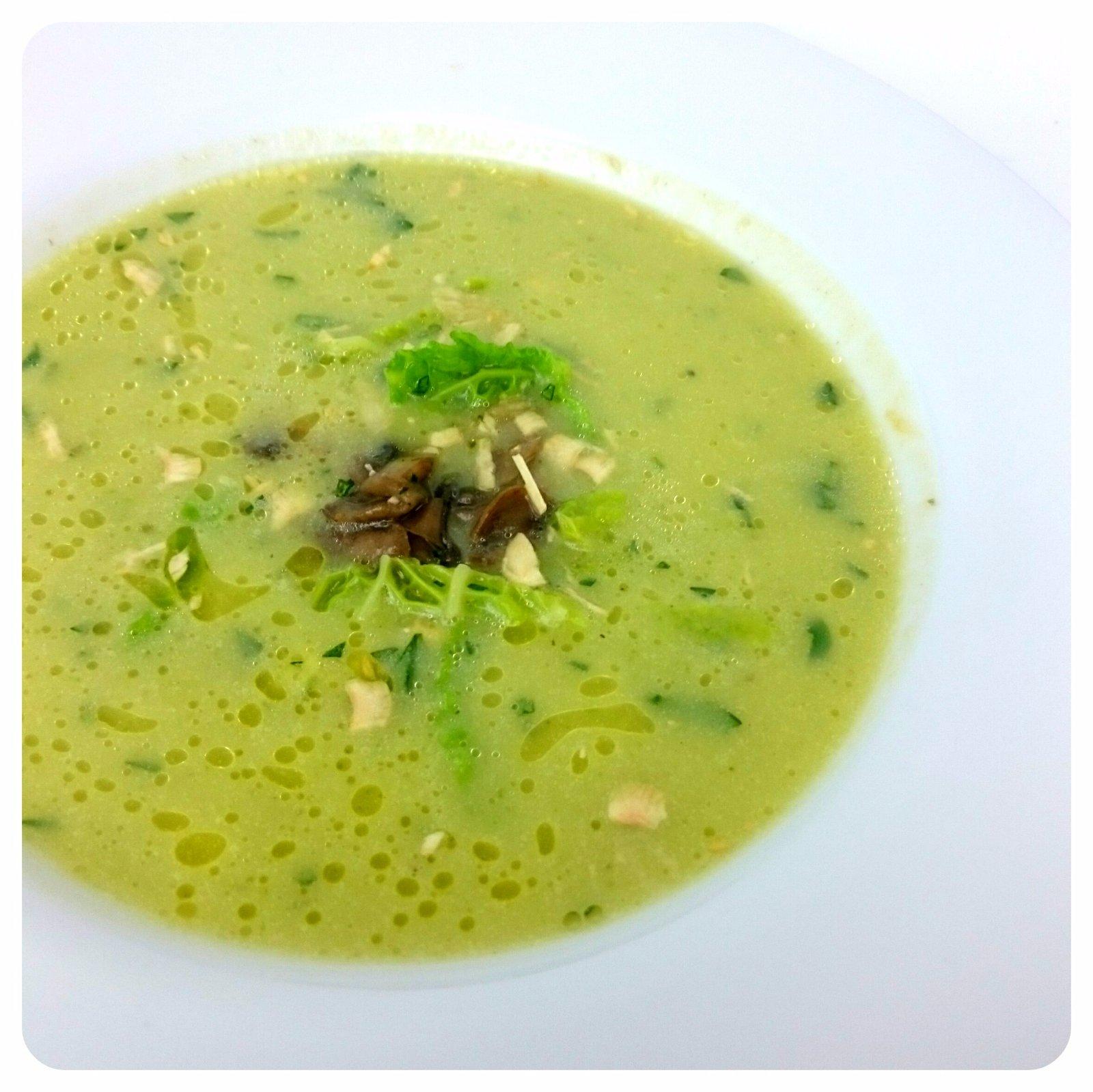 Kelový krém so šampiňónmi, kelovými "rezancami" a lieskovcami.