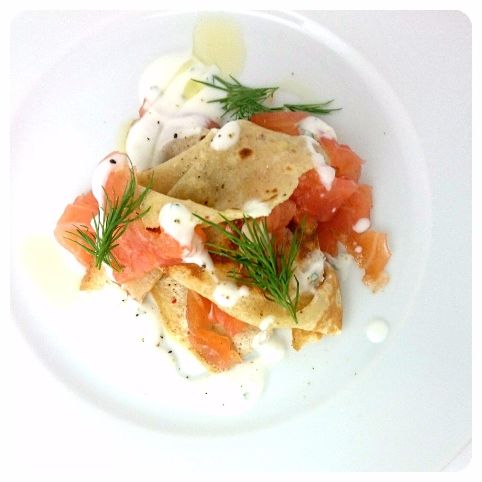 Gravlax (surový losos marinovaný v zmesi cukru, soli a kôpru), pohánková palacinka, smotana, korenie.