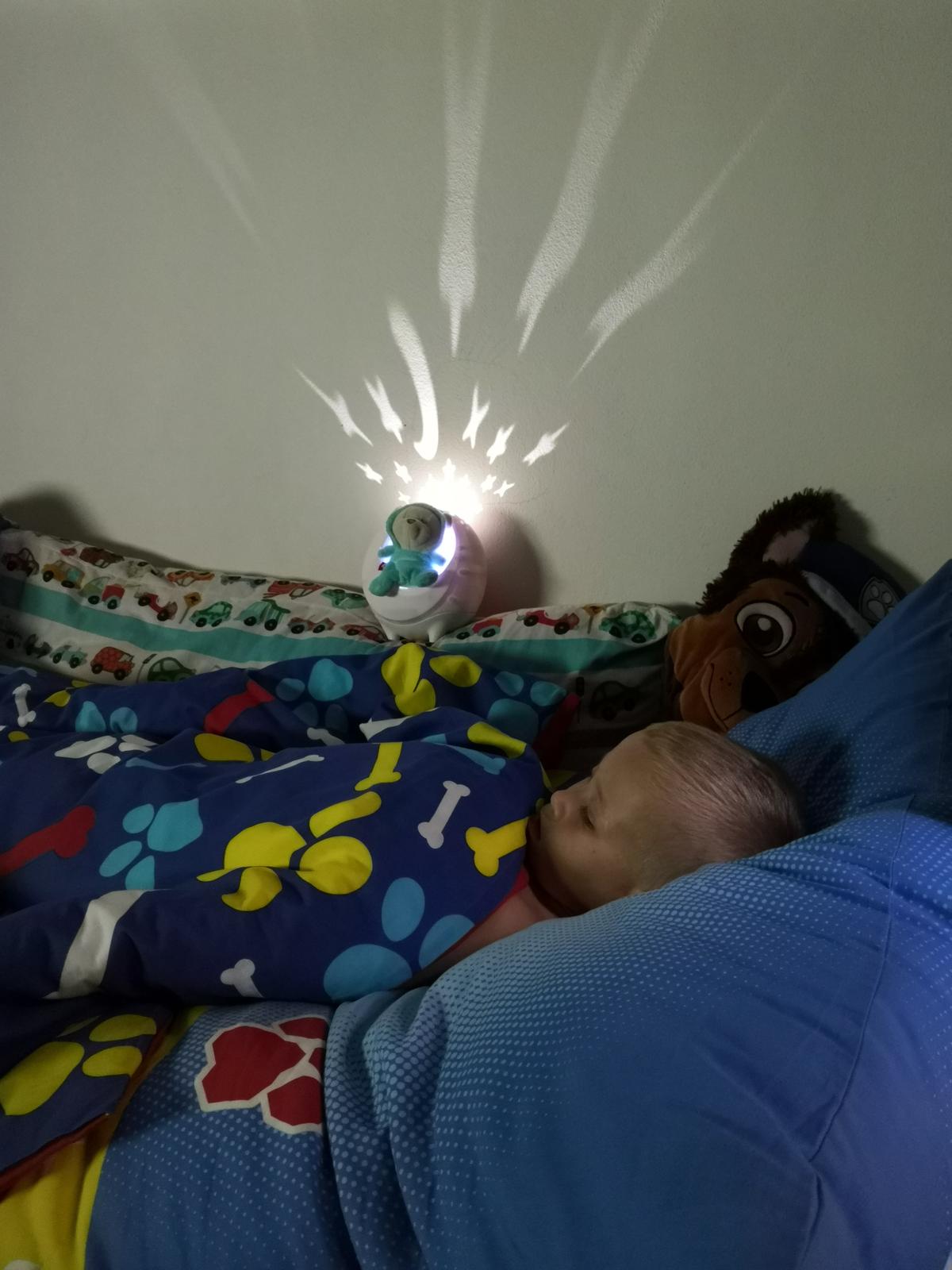 Tak tento projektor neměla Eli ani možnost vyzkoušet, protože si ho hned zabavil Matyášek (5 let) do svého pokojíčku. Každý večer si ho bere sebou do postele, položí si ho na polštář ke zdi a pustí si hvězdičky. Tím, že je Maty strašpytel a bojí se tmy, tak to je pro něj super pomocník při usínání a má ho místo lampičky. Jen tedy, aby byly hvězdy po celém stropě, tak by musel být umístěn uprostřed místnosti. Medvídek je opravdu krásný a roztomilý. Projektor lze nastavit na 10,20 a 30minut, po této době se sám vypne. I u tohoto projektoru lze pustit buďto hudbu a nebo bílý šum. Jde i zesilovat zeslabovat podle potřeby. Provedení je moc pěkné a hlavně i kvalitní (soudím podle toho, kolikrát už spadl na zem a je stále v TOP stavu). Méďa se dá prát v pračce, což je také dost praktické. Určitě bych ho doporučila nejen pro miminka, náš předškolák je tomu důkazem 😉.
