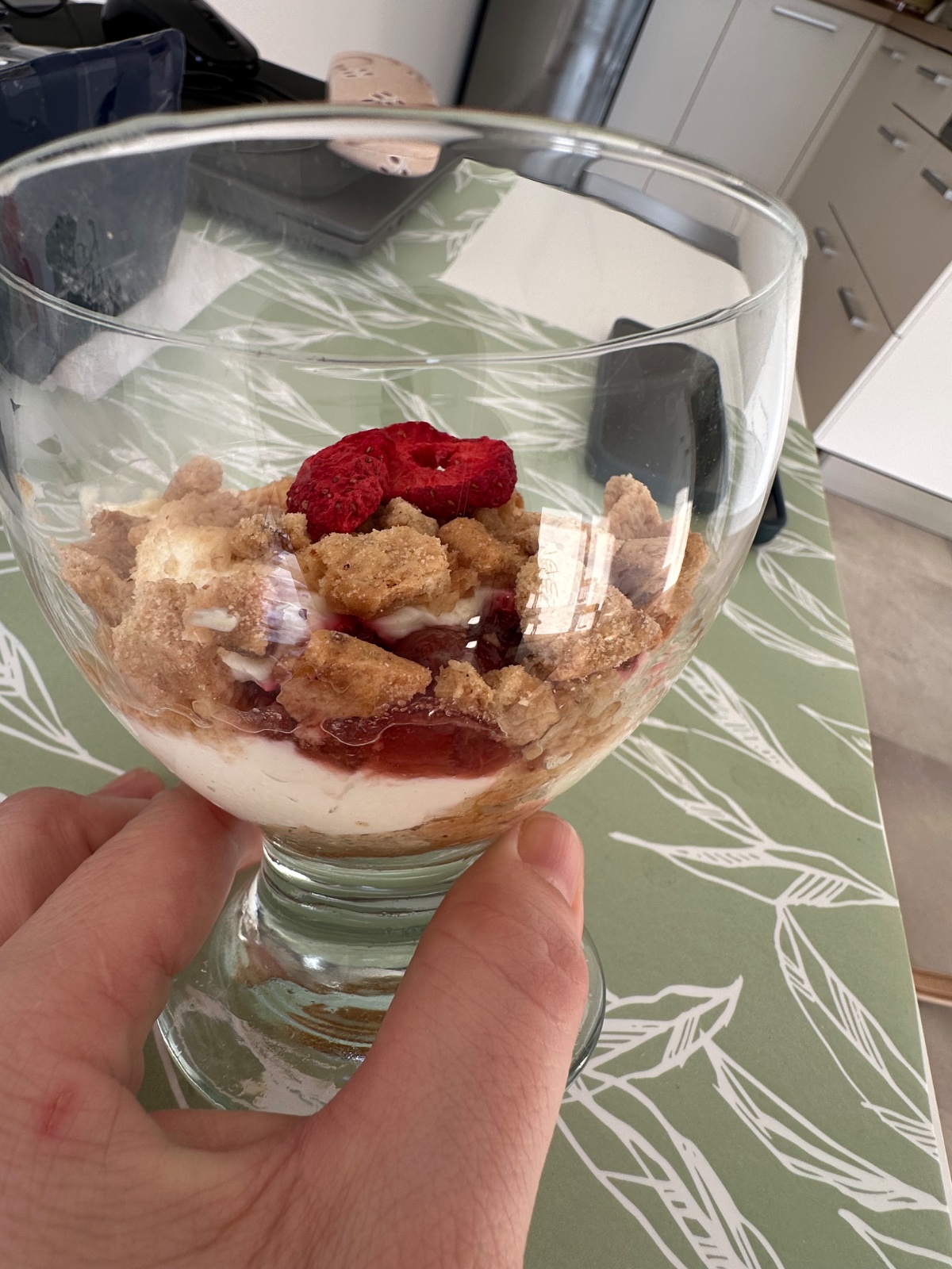 Tvaroh, protein, jahody, marmeláda, drcené sušenky