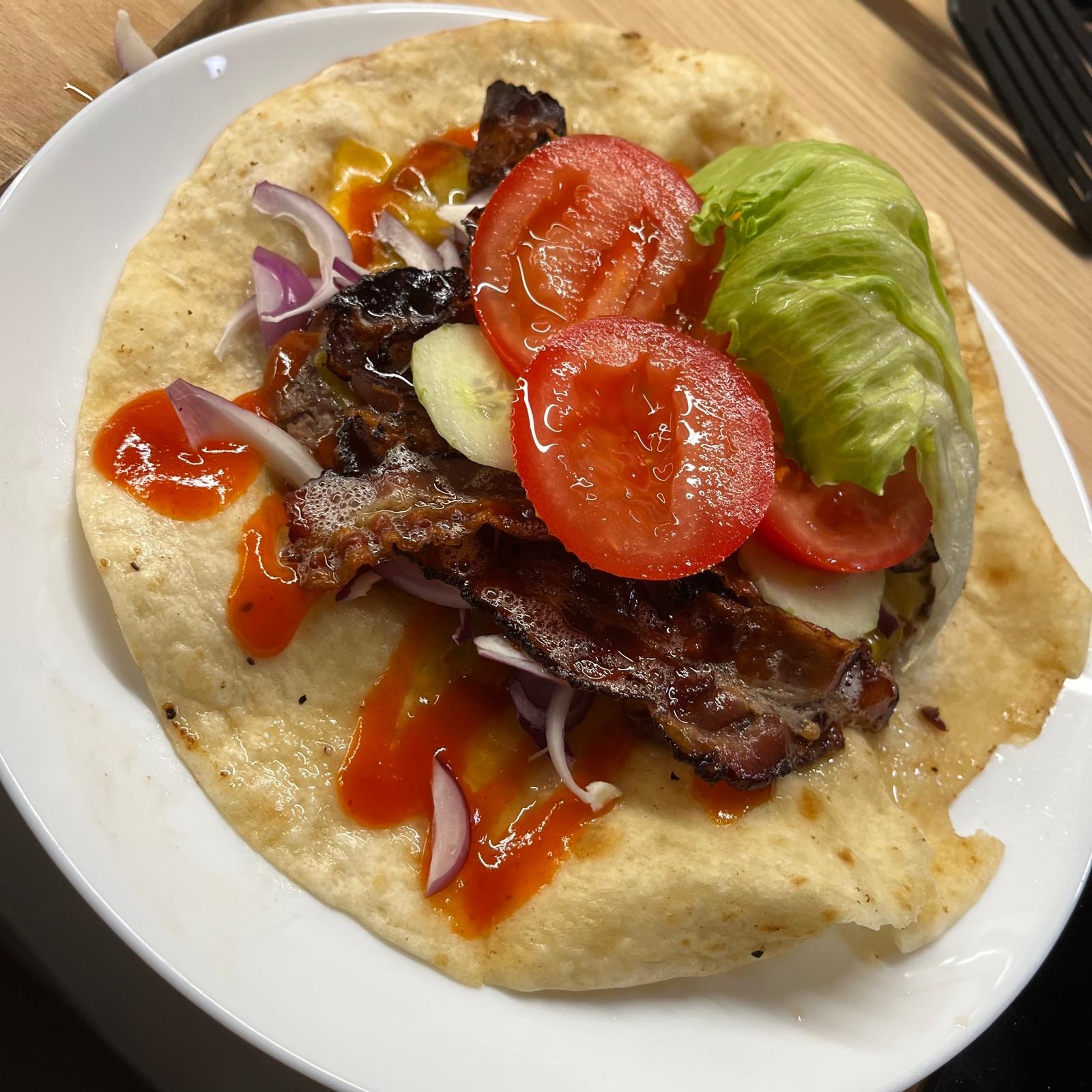 mleté hovězí maso ma tenko připlácneme na placku a opečeme, pak otočíme a poklademe čedarem. Vyjmeme z pánce a naskládáme šalotku, omáčku, rajče, okurek, salát, opečenou slaninu. Přehneme napůl.