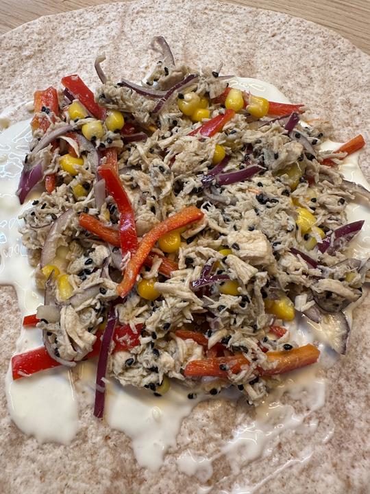 trhané kuřecí, tošku vývaru, sojovka, avokádový olej, sezamové semeno černé, cibule, paprika, kukuřice. Dip: zakysaná smetana, česnek, lžička majolky, nastrouhaný pamazán