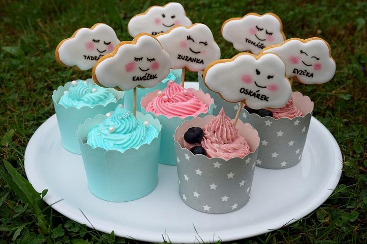 Detail cupcakes❤ V mátovém košíčku - světlý korpus plněný čokoládovou ganache a malinami, krém- tvaroh, mascarpone a smeana. Ve hvězdičkovém košíčku jsou bez mléka, lepku a sóji. Korpus s hruškami a jablky, plněné povařenými hruškami a borůvkami a krém s kokosovou smetanou a borůvkami❤ Bezlepkové, mezmléčné (i bez sóji) perníčky.