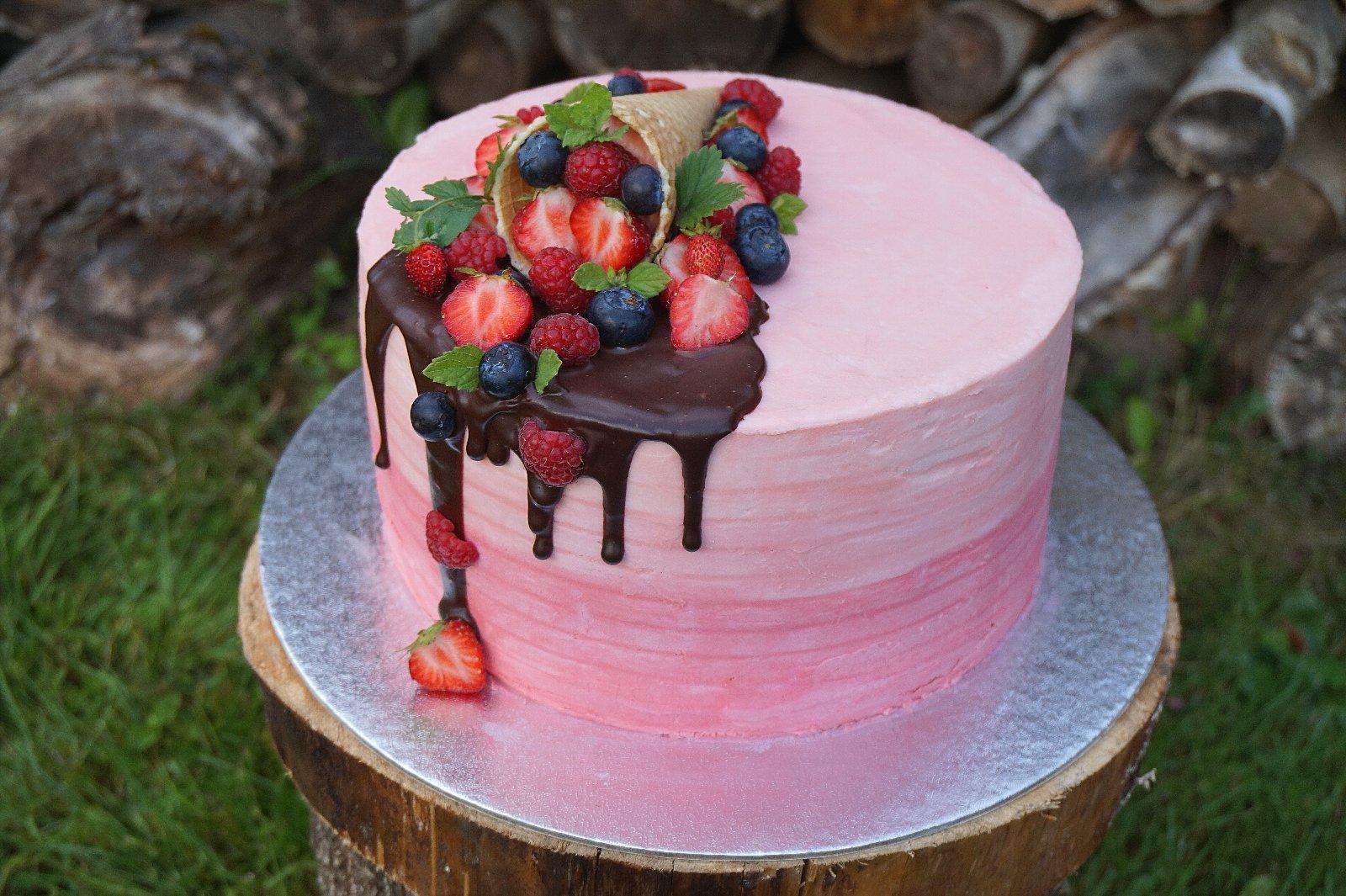 Poté si připravíme čokoládovou polevu. Necháme vychladit na pokojovou teplotu, ideálně 30 °C. Čokoláda o této teplotě krásně stéká po bocích dortu a zároveň nehrozí, že by rozpustila krém. Polijeme část dortu, položíme zmrzlinový kornoutek (můžete naplnit zbytkem krému) a dozdobíme ovocem (jahody, borůvky, maliny, meduňka…)
