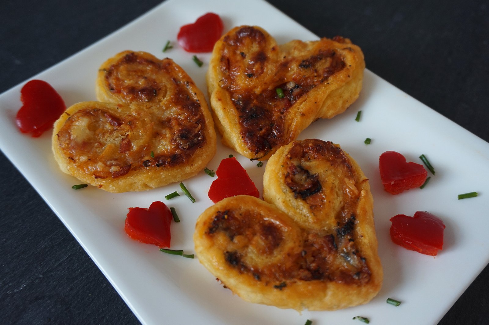 Těsto rozdělíme na 2 části, vyválíme (obdélník) a potřeme protlakem (sůl a italské bylinky). Posypeme anglickou slaninou a sýrem. Potom z obou delších stran těsto stočíme do poloviny. Dvojroládu krájíme ostrým nožem na plátky silné asi 1,5 cm a prsty dotlačíme "špici" srdíčka. Potřeme vajíčkem a pečeme dozlatova.