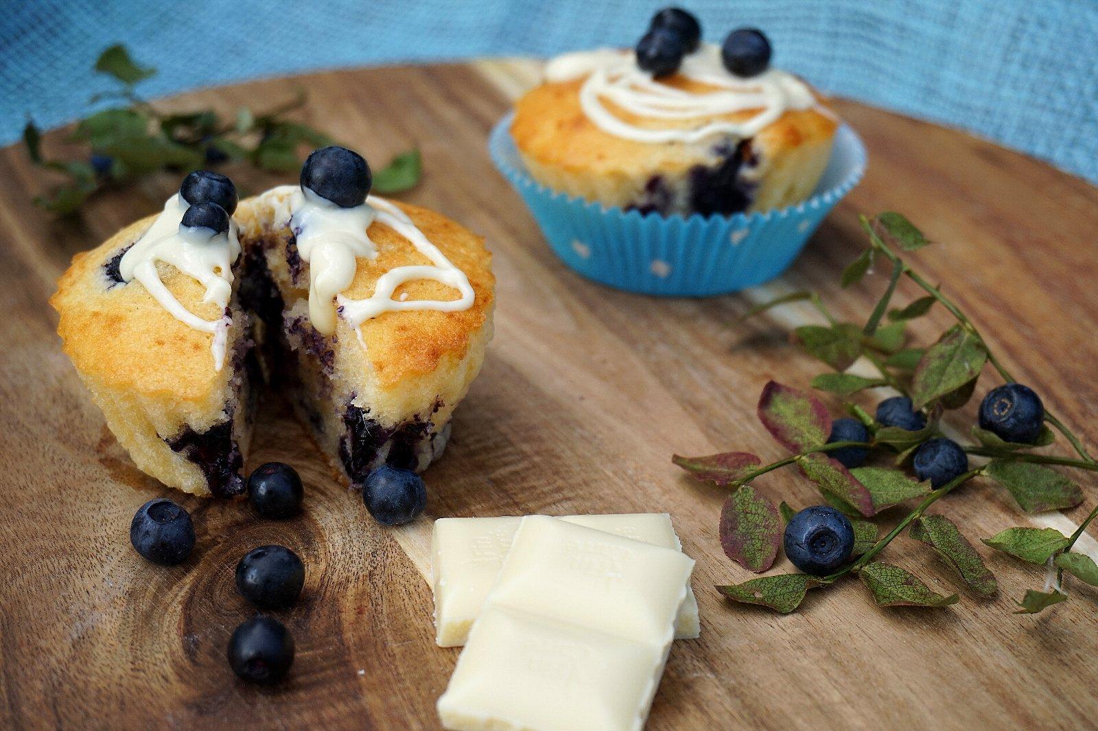 Upečené a vychladlé muffiny pokapeme bílou čokoládou, kterou jsme rozpustili ve vodní lázni a ozdobíme borůvkami.