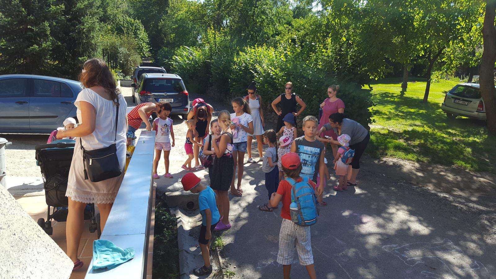 Před 15.hodinou jsme se začínaly připravovat k odchodu, já šla vzbudit svou Šípkovou Růženku, která vstává zadní částí těla, a tudíž se nám příprava trochu natáhla. Srocujeme se před budovou a mně to připomíná odchod na mimoškolní akci se studenty. Akorát trochu mladšími. Asi tak za hodinu se odlepujeme od zdi a vydáváme se za vrcholným zážitkem. Děti nadšeně šlapou do rozpáleného asfaltového kopce linoucího se za ves, z batůžků s Elsami a Trolly trčí flaštičky s pitím a zásadní koupací potřeby.