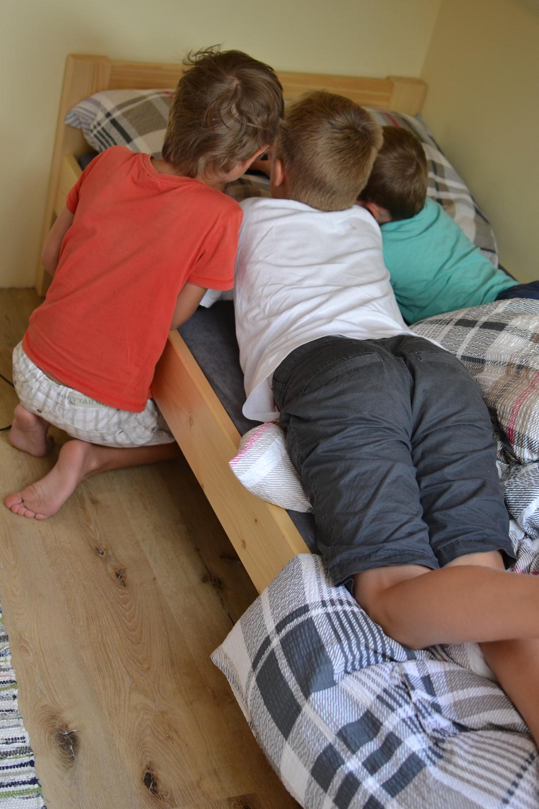 Je pravdou, že to je trochu nadnesený výraz vzhledem k počtu dětí, ale věřte nebo ne, chalupa lehce ztichla, starší se srotily u tabletů a pohádek (povinně), část mladších usnula (jupííí i ta moje) a část se tak nějak v tichosti pohybovala mezi rádoby odpočívající matkou a pokojem. Zavoněla káva a znovu jsme se sešly u jednoho stolu, tentokrát abychom naplánovaly odpolední program. Vzhledem k tropickému počasí se nabízely vodní aktivity, žel nejbližší koupací rybník byl 2,5km daleko. Zasedla sabatová rada, vítězila naše pohodlnost. Pomocí mapy.cz jsme našli mnohem bližší rybník, kde byl zakreslen jakýsi symbol, který by mohl znamenat při dobré vůli kemp, a my si s nadšením okamžitě domyslely pláž s bílým pískem a úžasnou letní atmosférou. No musím se smát, jen to píšu.