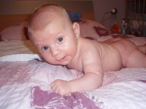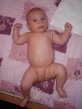 V 6. měsíci vážím 8100g a měřím 67cm...lezu po čtyřech dozadu a mám dva zuby dole 🙂 V 8. měsíci vážím 8600g a měřím 71cm, moje hlavička má 44cm, lezu krásně rychle po čtyřech, stavím se na dvě nožky o nábytek, žvatlám, když mám dobrou náladičku a prořezávají se mi zuby nahoře a dost to bolí! Další fotky najdete tady.