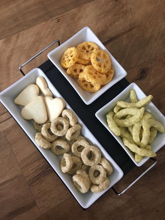 Viděla jsem v Olomouci přípravu objednané oslavy (ne naší) a dětem podávali klasické slané křupky (s hnědým obalem, jak je známe), hodně sladkých bombonů (ve stylu bompari) a další extremně sladké sušenky...