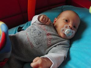 V 6.týdnu vážil 5kg a měřil 58cm,krásně pase koníky,usmívá se na mamku🙂).v 9.týdnu si začal strkat pěstičky do pusinky a nacvičuje otáčení,ale zatím to nejde🙂