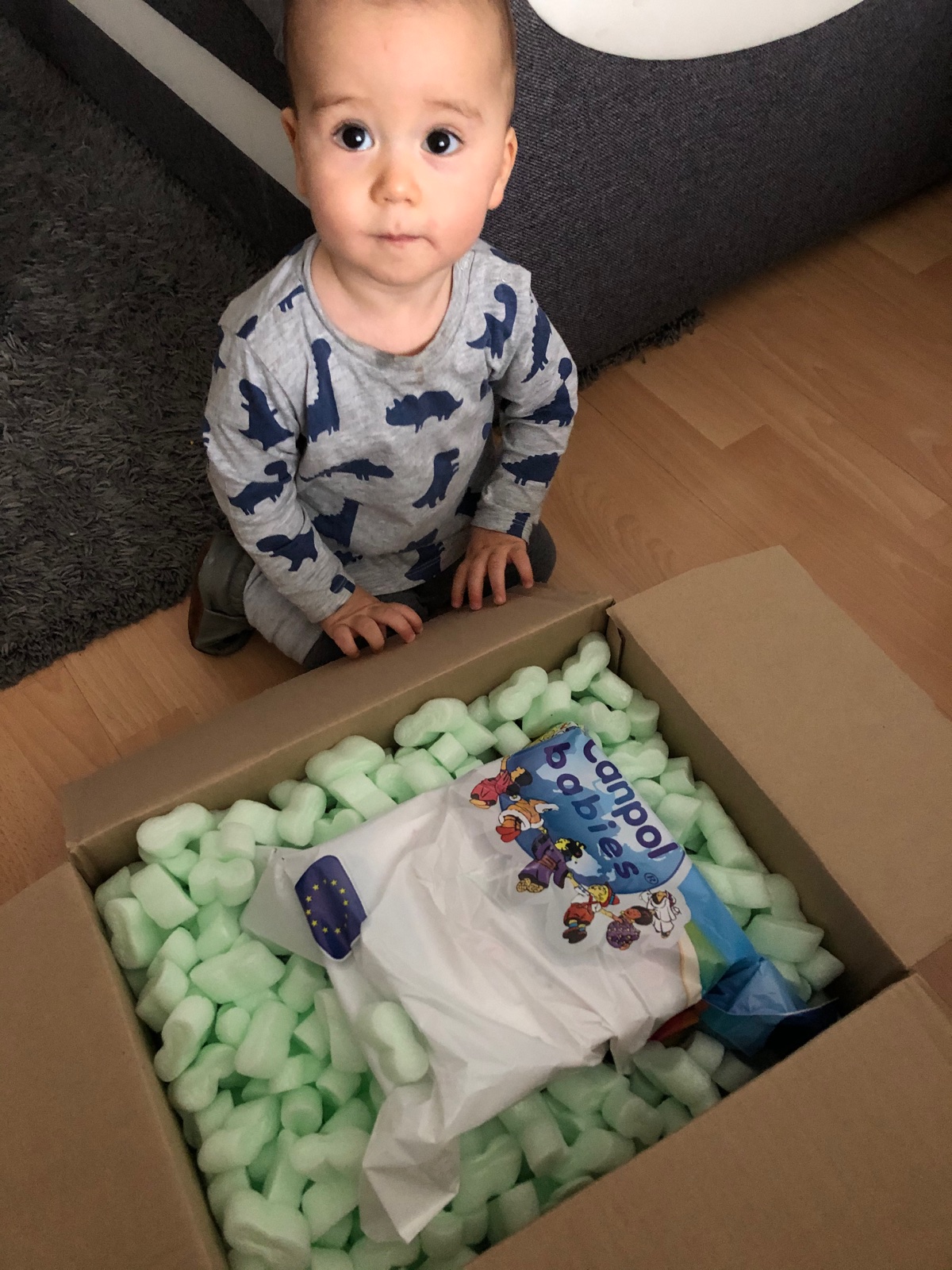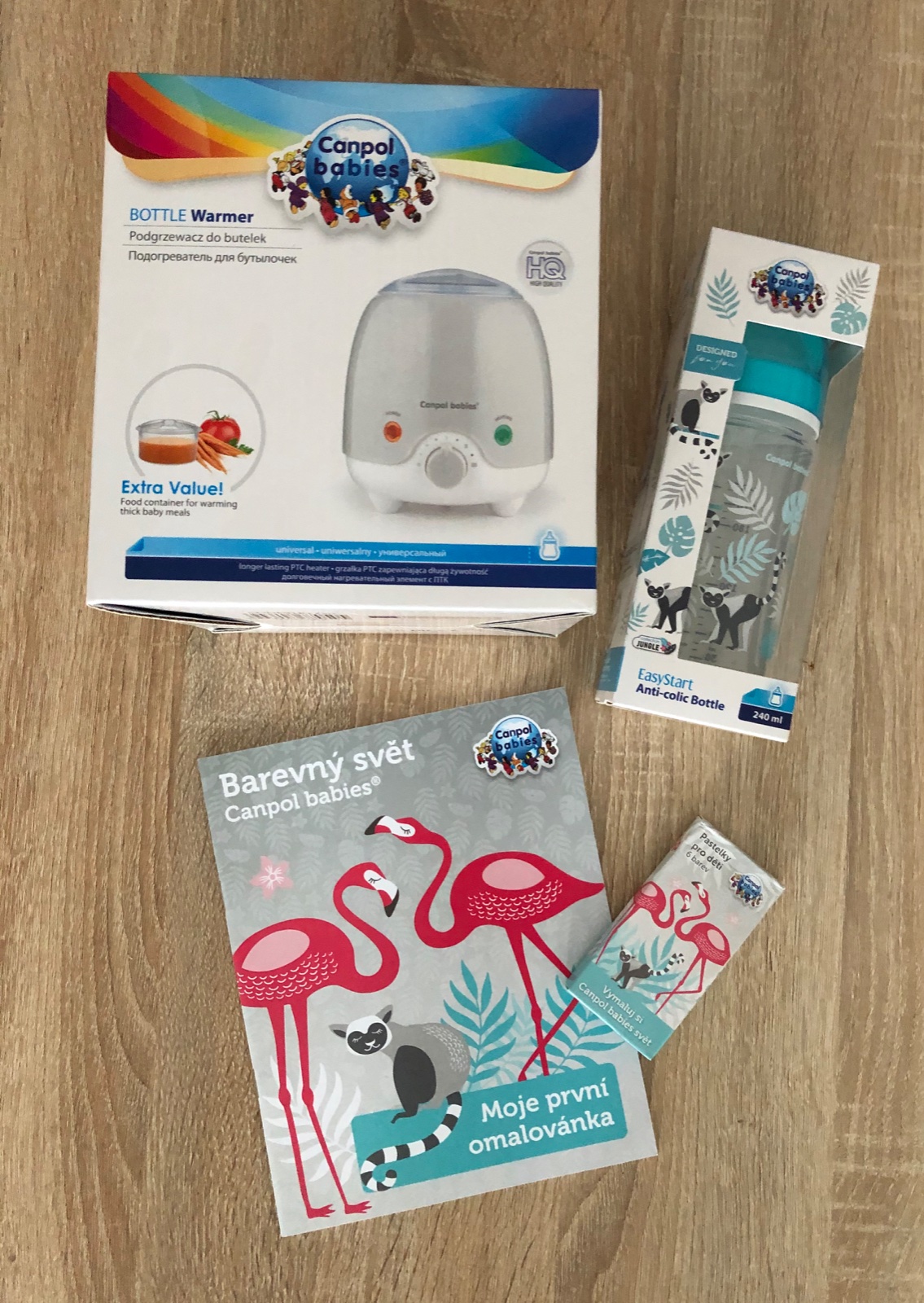 Když přišel balíček, Vašík se na něj hned vrhl🙂 Krom ohřívačky, ke které je i mistička s víčkem na příkrm, přišla i krásná lahvička a jako dárek pastelky a omalovánky.