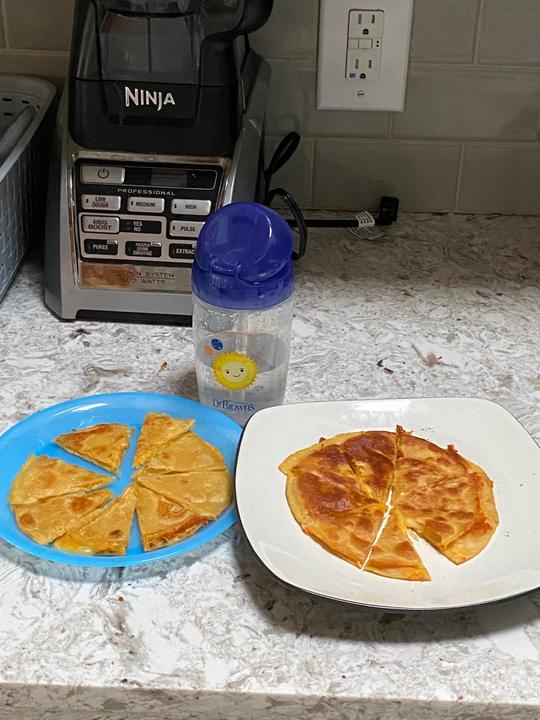 Dnes k obědu pro sebe a Mavericka - sýrová quesadilla. Není to nic jiného, než dvě kukuřičné tortilly plněné sýrem čedar. Ještě si dáme nějaké ovoce, vodu na zapití a máme vystaráno.