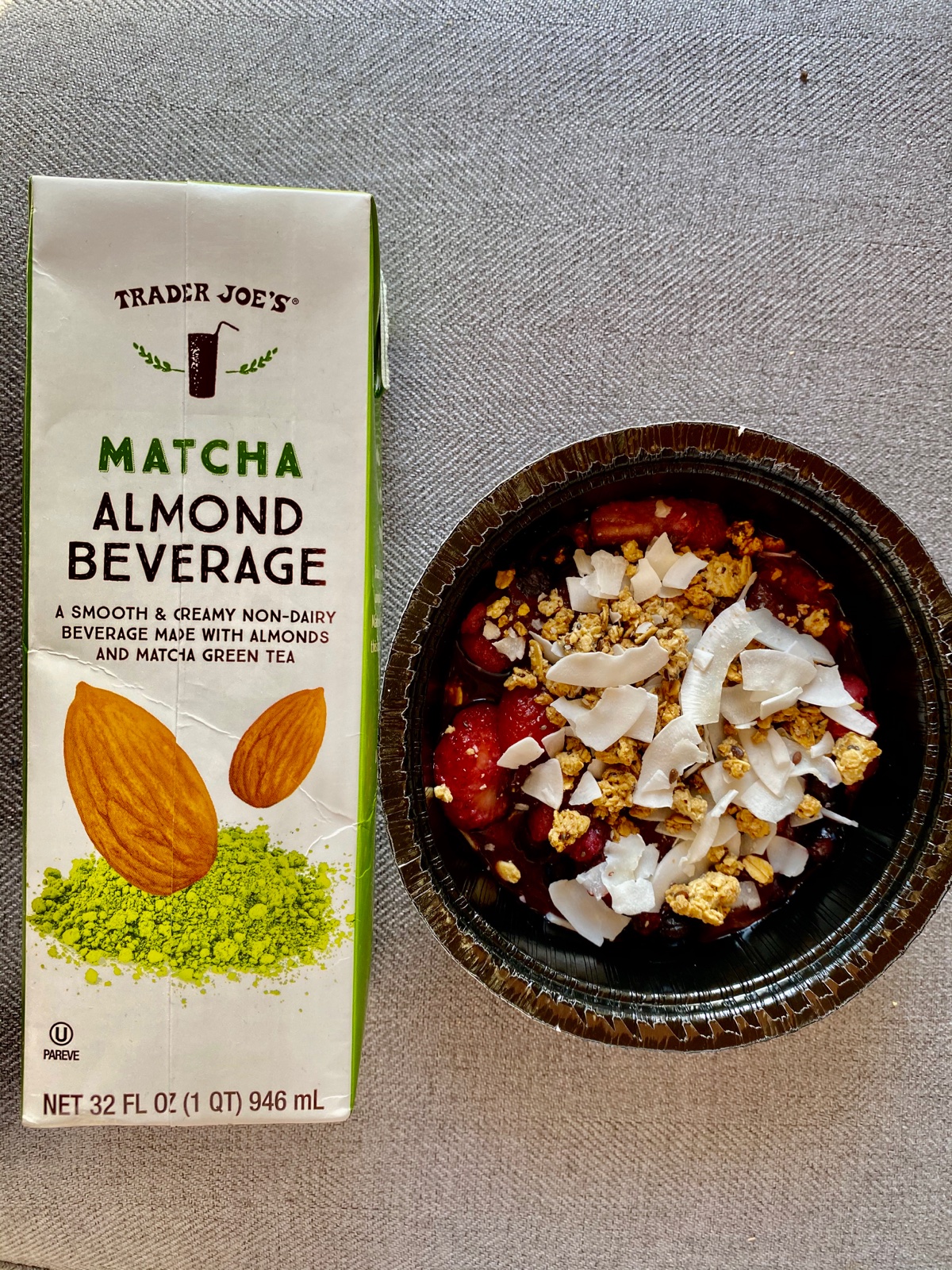 Açaí Bowl a mandlove mleko s matchou dnes k snidani.