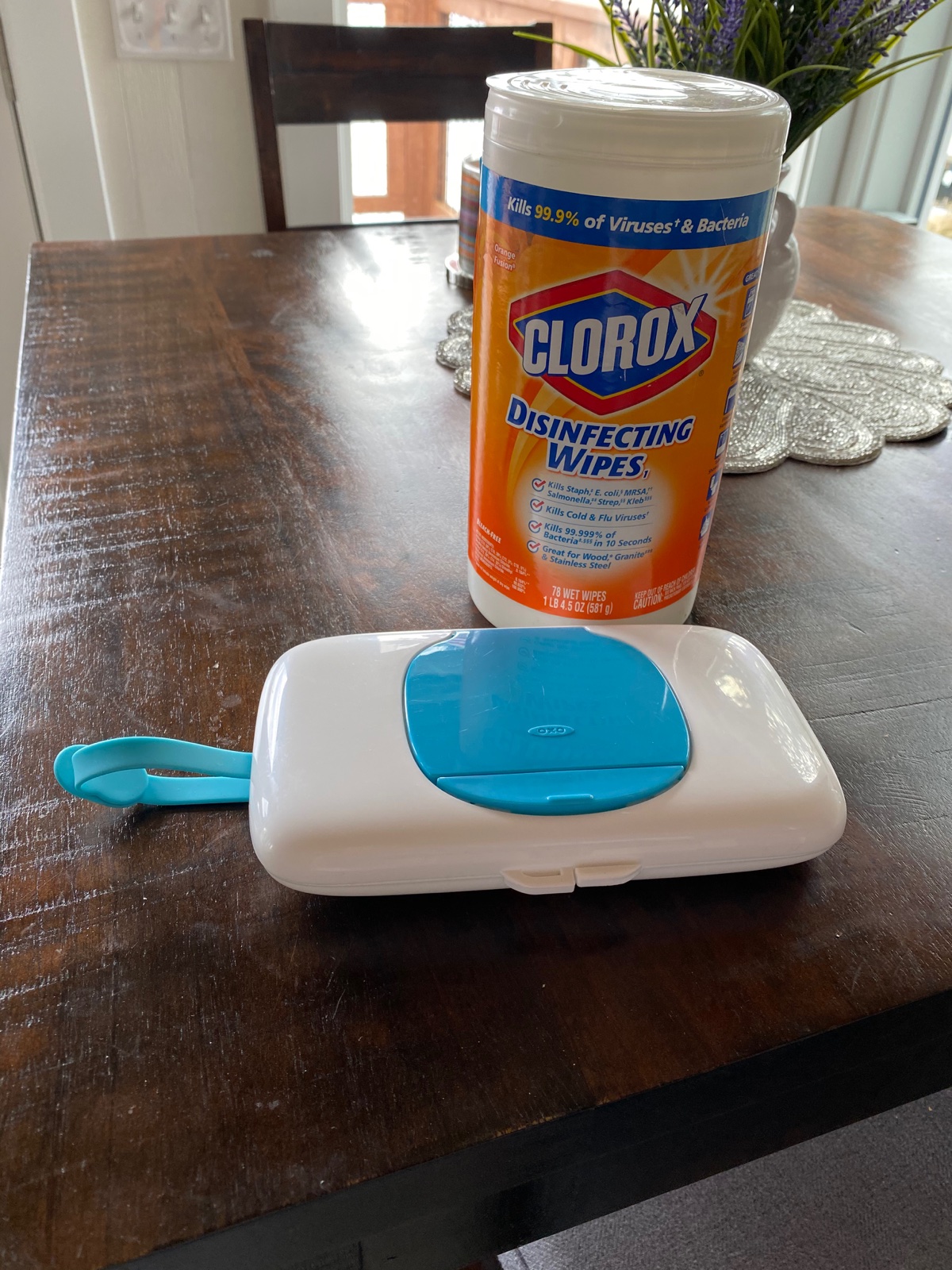 Vyrobila jsem mu takové cestovní pouzdro, kde má silné dezinfekční ubrousky. Ty se tady prodávají ve velkých tubách, které přeci jen nejsou na cestování. Teda takhle, prodávají se i v menších balení, které jsou teď k nesehnání. To pouzdro je na dětské ubrousky, ale mám ještě jedno, takže ho teď oželím. Nacpala jsem tam kolem třiceti ubrousků. A hned mám lepší pocit.